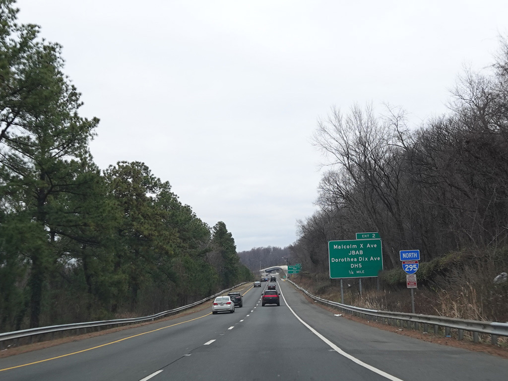 Exit 5A is for the Southeast Freeway (I-695). I-295 ends here. The Anacostia Freeway continues straight ahead as DC 295, which is marked as exit 5B. Exit 5C is for 11th Street SE and Martin Luther King Jr. Avenue.