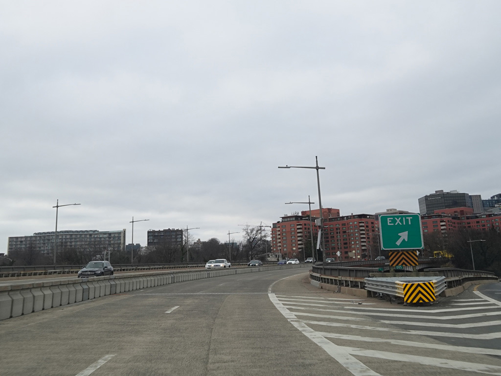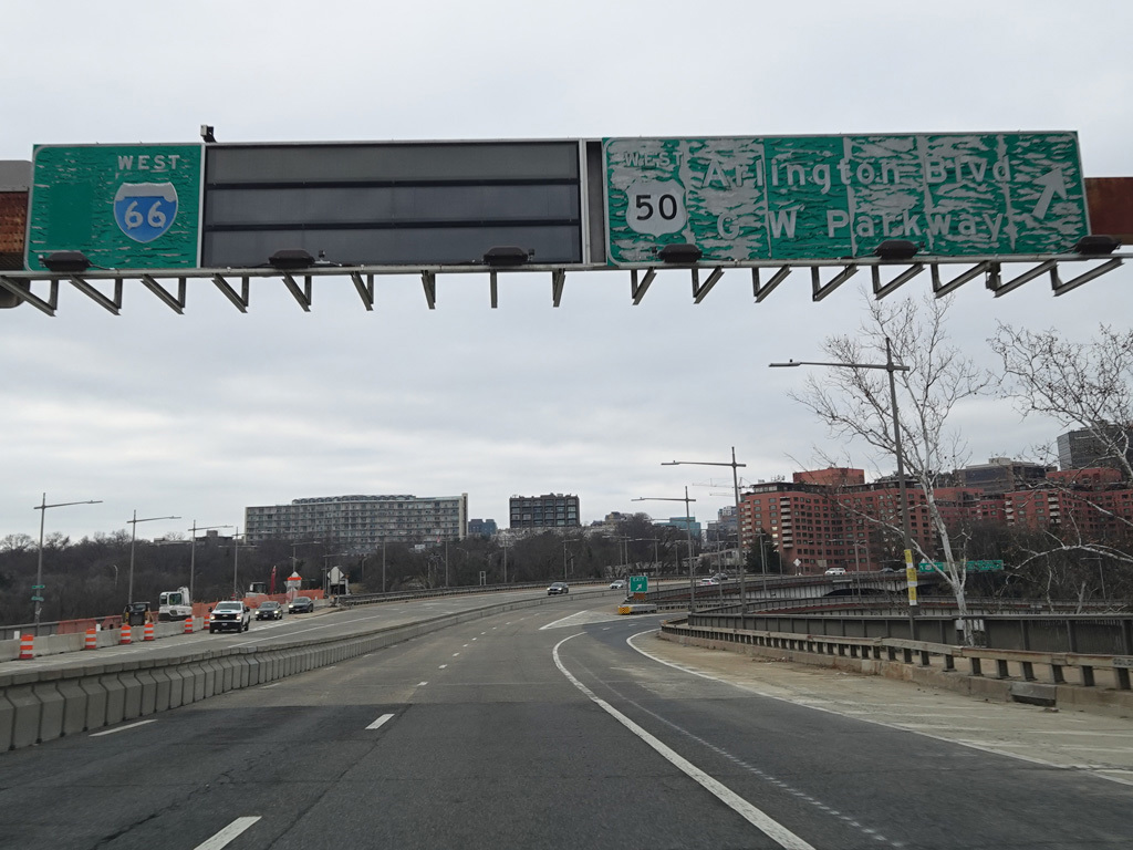 The Theodore Roosevelt Bridge crosses the Potomac River to Virginia. On the other side, there is an exit for Arlington Boulevard (US 50) and the George Washington Memorial Parkway. I-66 continues straight ahead into Virginia.