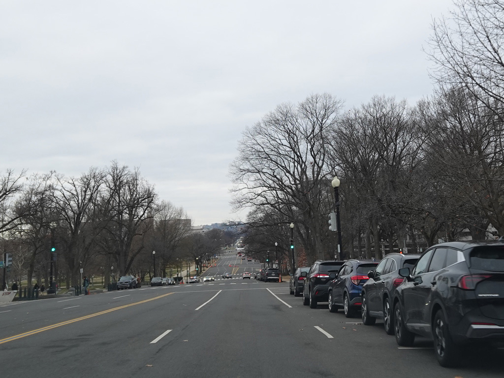 Maryland Avenue runs southwest as a two-lane divided road. The United States Capitol is visible in the distance.