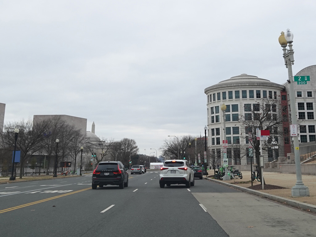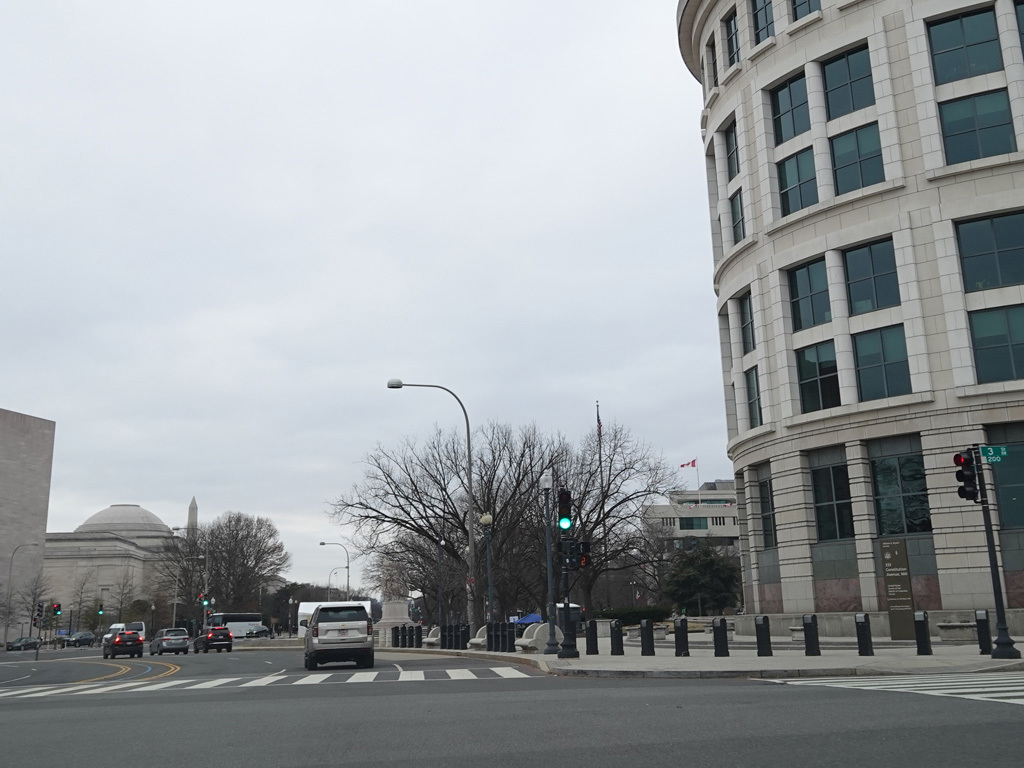 Constitution Avenue runs west as a six-lane undivided road. The National Mall is on the left.