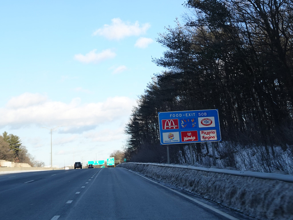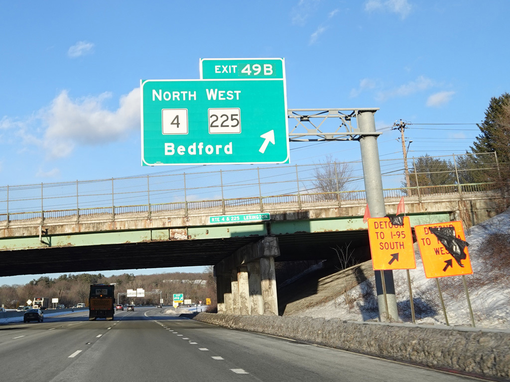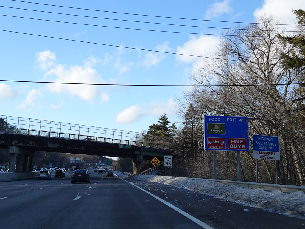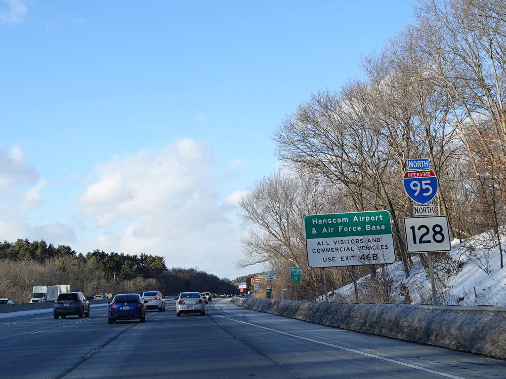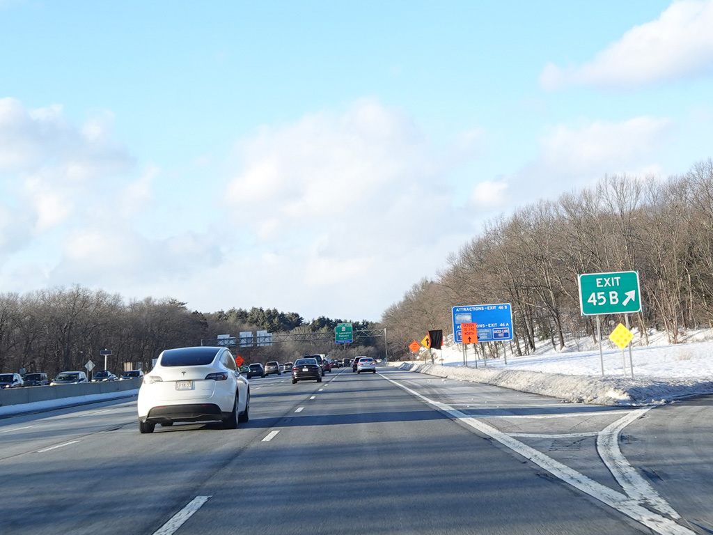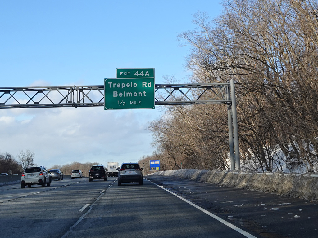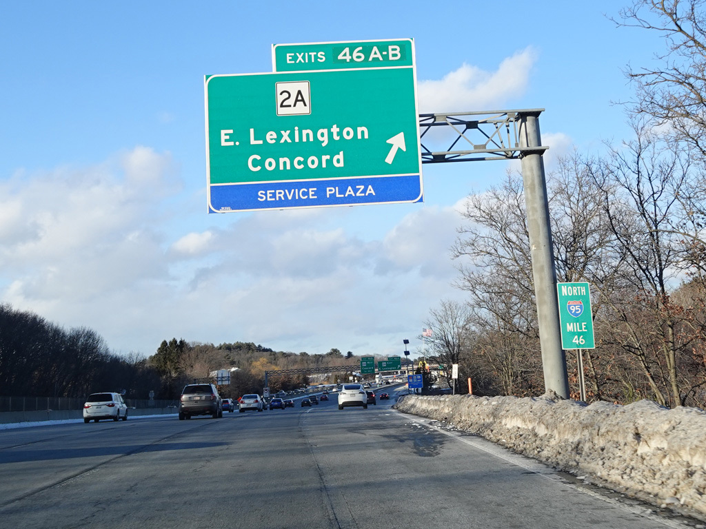 Exits 46A-B are for Marrett Road (MA 2A). The Lexington Service Plaza is also accessed through this ramp.