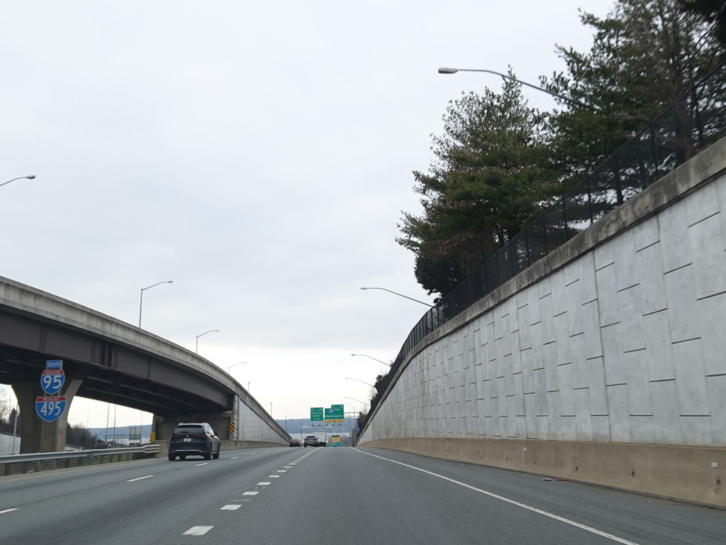 Exit 27 is for the Capital Beltway (I-495) west. Straight ahead, I-95 is multiplexed with I-495 east along the Beltway for the remainder of its length in Maryland. There is a weigh station at exit 27. Trucks must exit here when the weigh station is open. There is access to continue on I-95/I-495 through the exit for trucks using the weigh station.