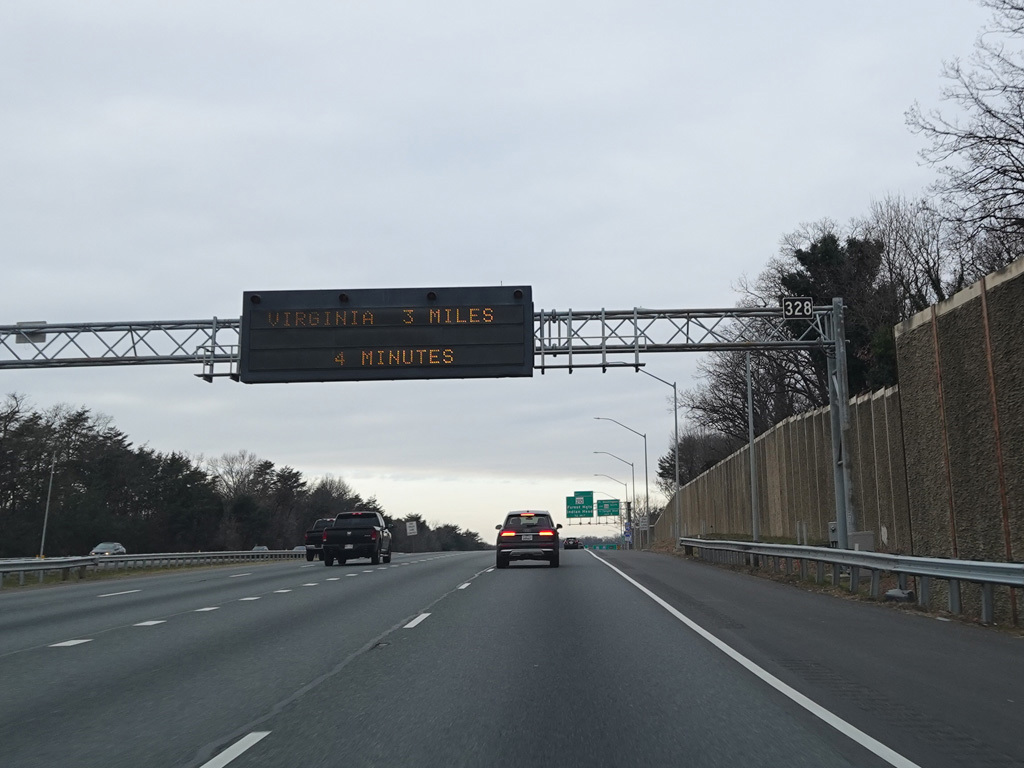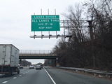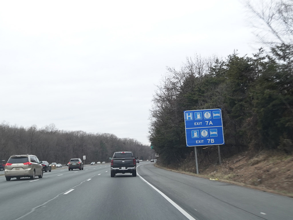 Shortly before crossing into Virginia, the Beltway splits into through and local lanes. There is advance signage for this split before exits 4B-A. The signs indicate which lanes should be used for which exits.