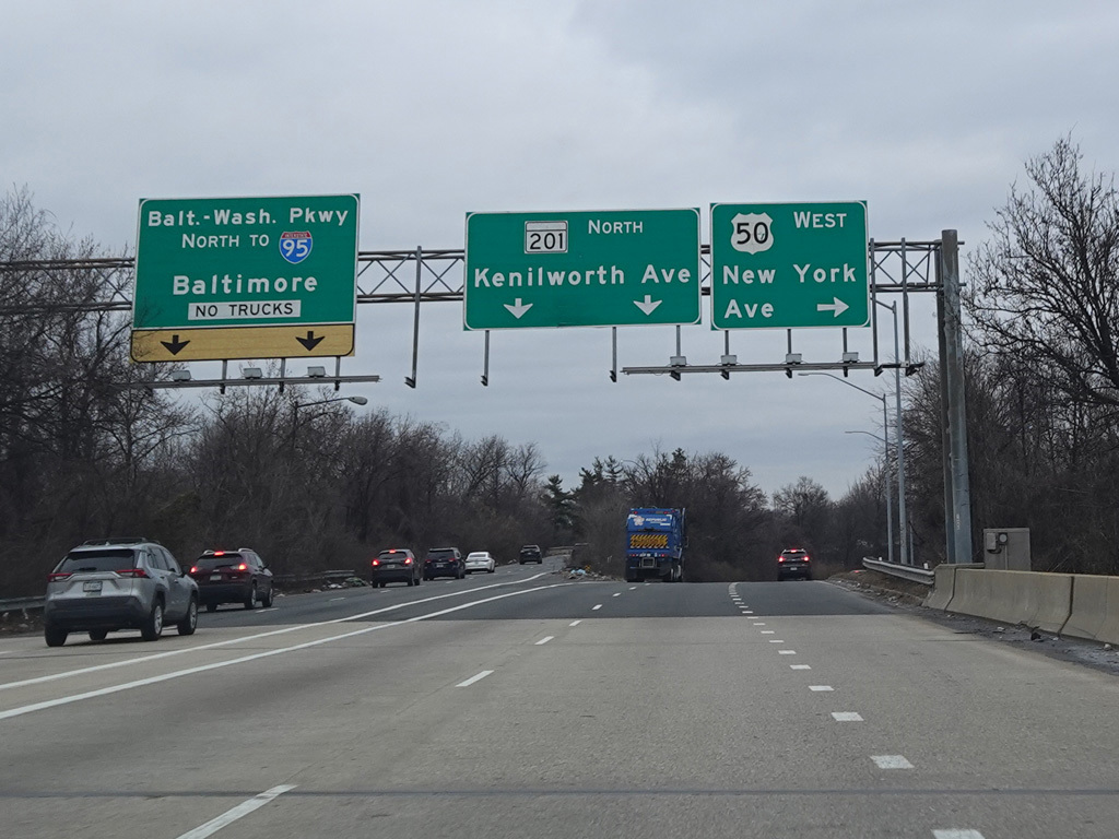 Welcome to Maryland! The Anacostia Freeway (DC 295) becomes Kenilworth Avenue upon entering the state. There is no signage marking the state line. Immediately, the roadway splits. Bear left for the Baltimore-Washington Parkway (MD 295) north, which begins here. The route number is not posted, as this section of the parkway is under the jurisdiction of the National Park Service. Bear right to stay on Kenilworth Avenue. There is a pair of exits on the right for the John Hanson Highway (US 50), which becomes New York Avenue just west of here as it enters the District of Columbia.