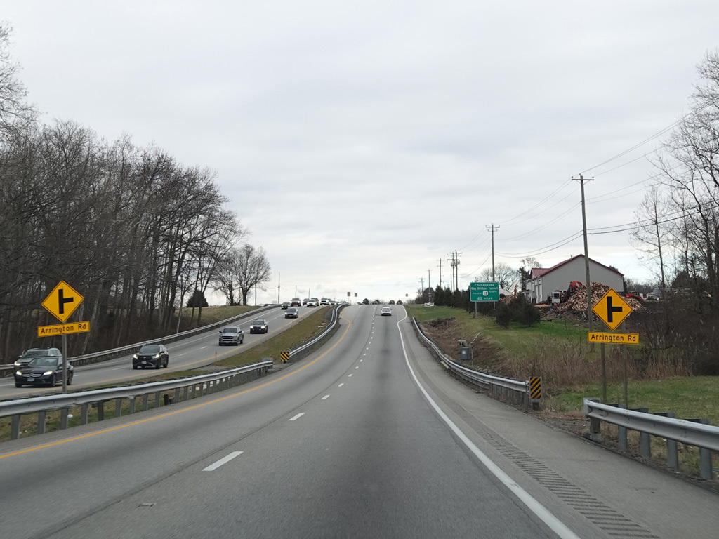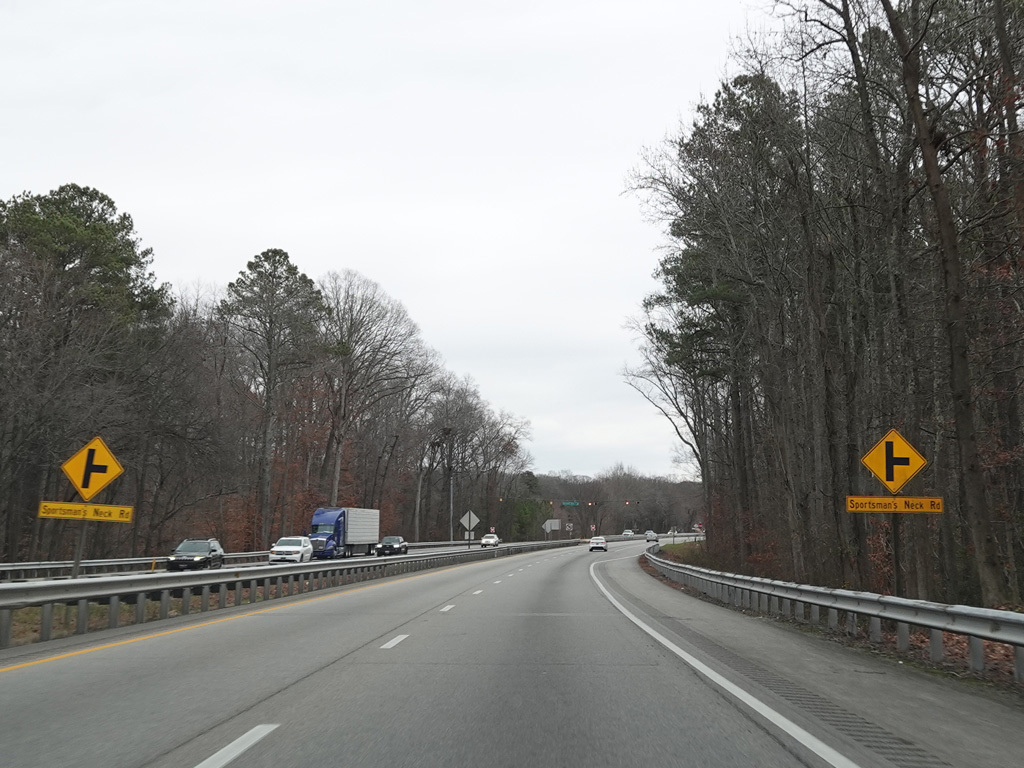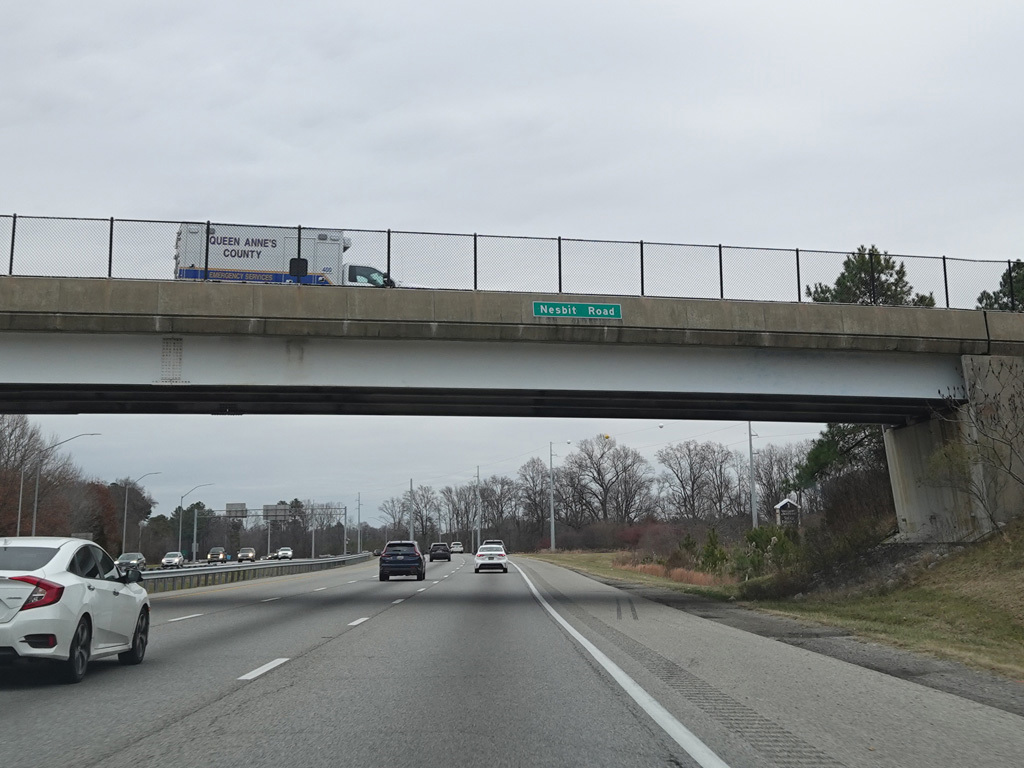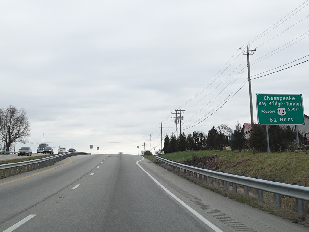 There is advance signage directing motorists to use US 13 south for the Chesapeake Bay Bridge-Tunnel or MD 404 east for the Cape May-Lewes Ferry. Arrington Road begins on the right at an uncontrolled intersection.