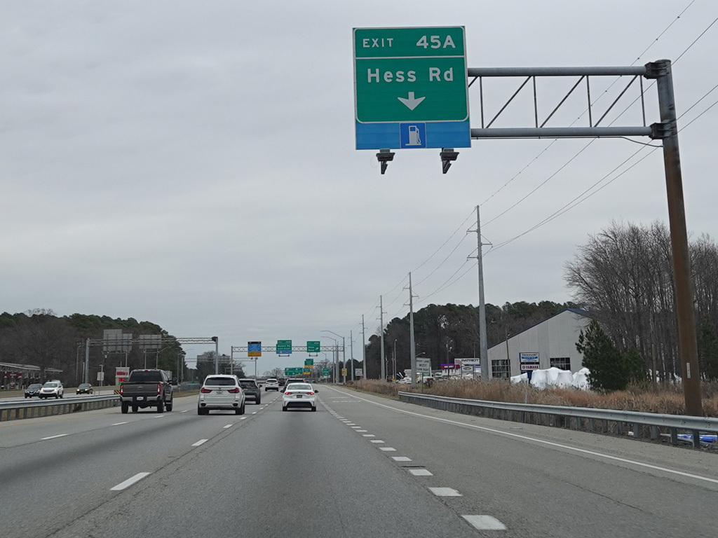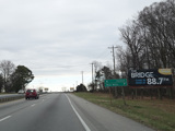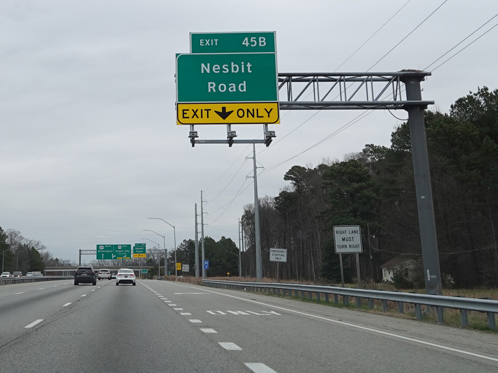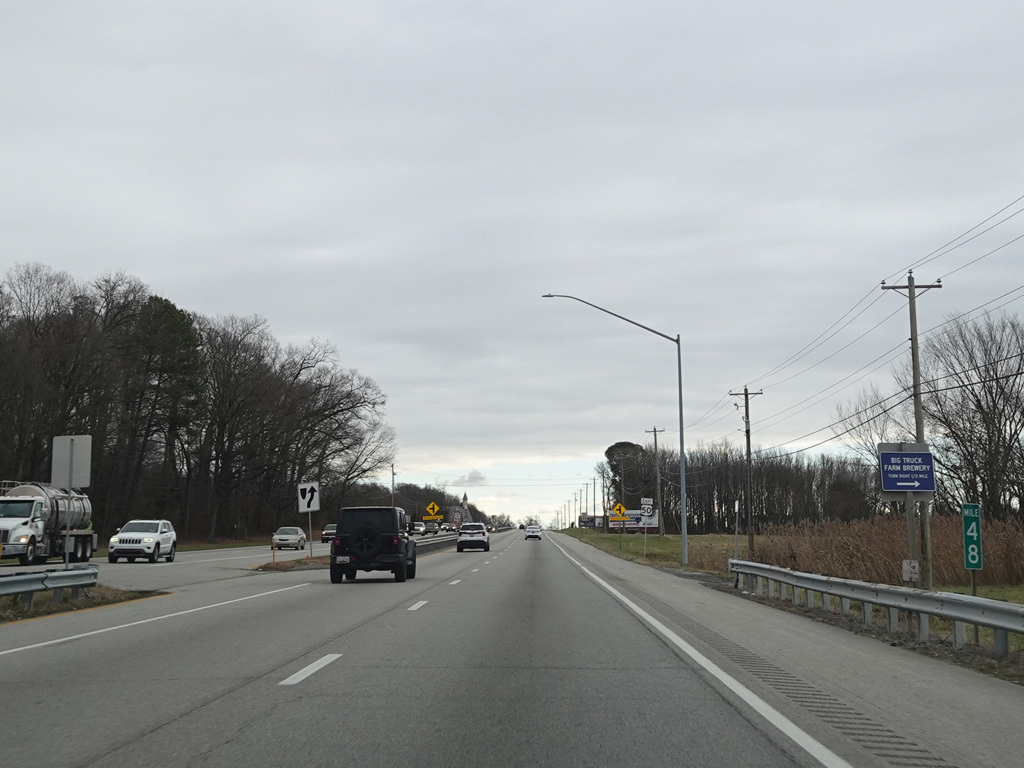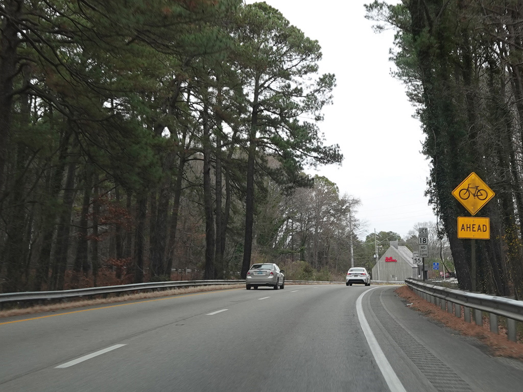 There is advance signage directing motorists to use US 13 south for the Chesapeake Bay Bridge-Tunnel or MD 404 east for the Cape May-Lewes Ferry. Arrington Road begins on the right at an uncontrolled intersection.