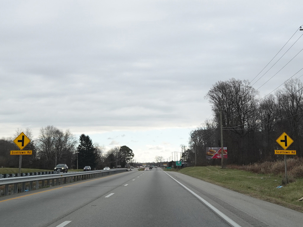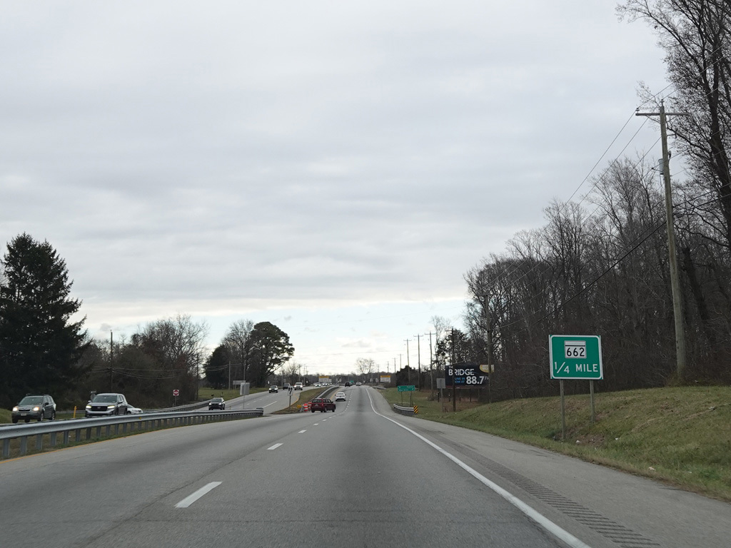 Scottown Road begins on the left at an uncontrolled intersection. There is an exit on the right for Wye Mills Road (MD 662).