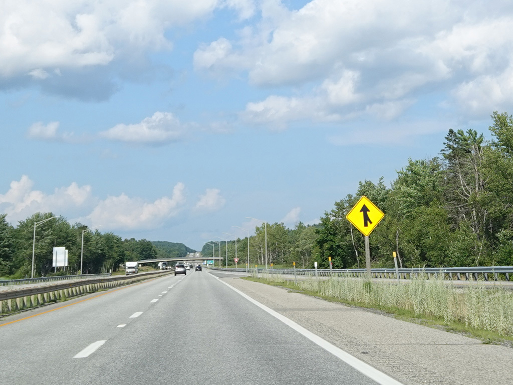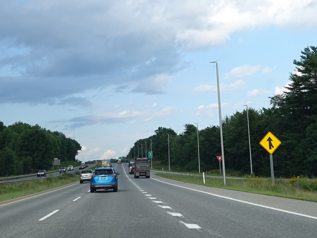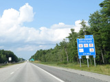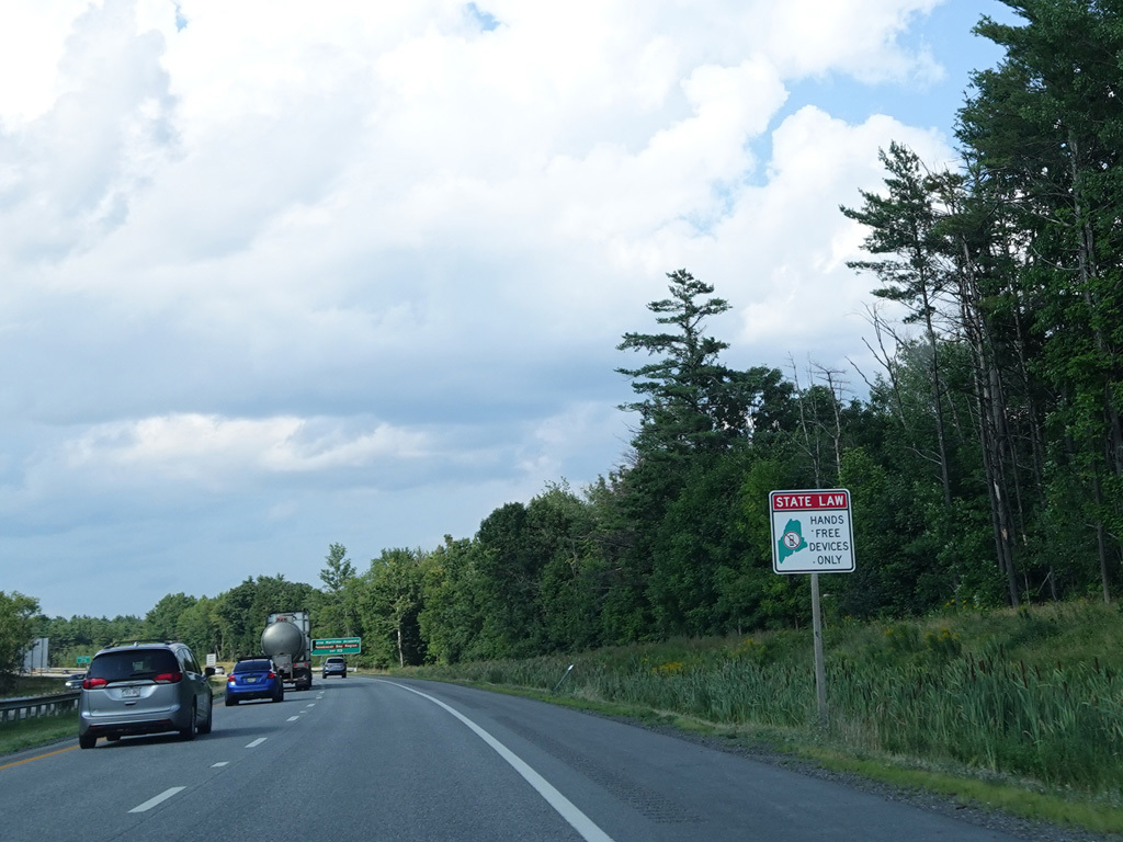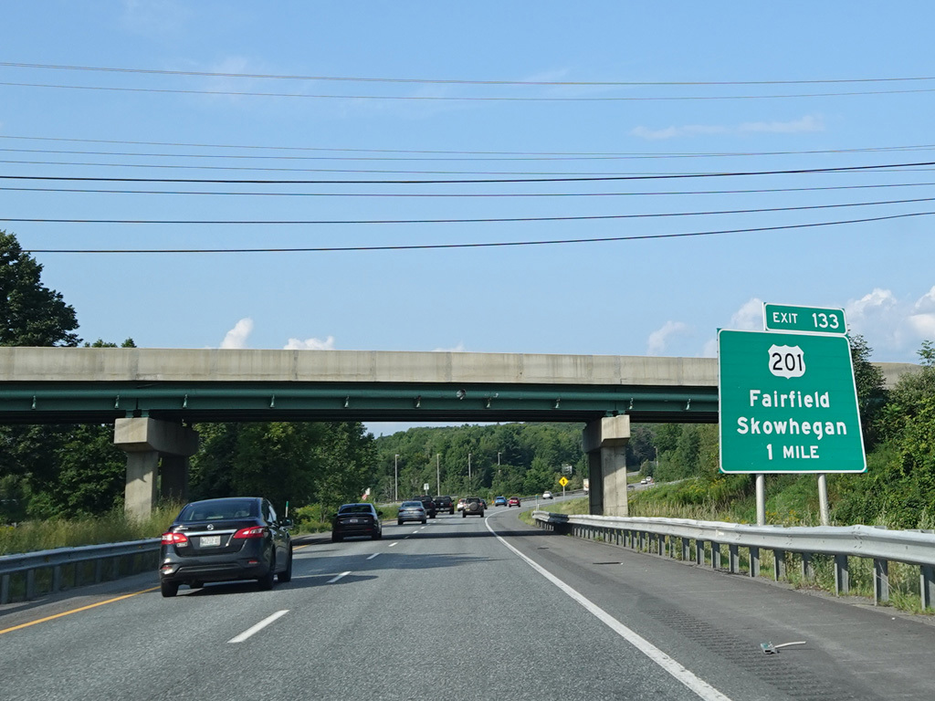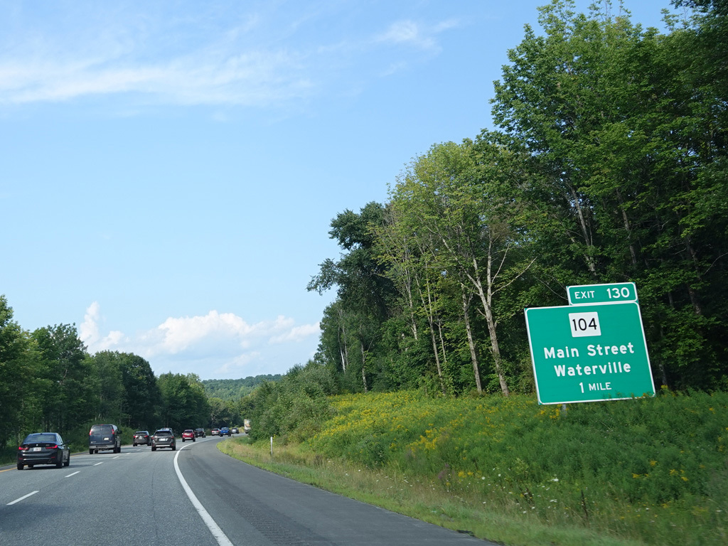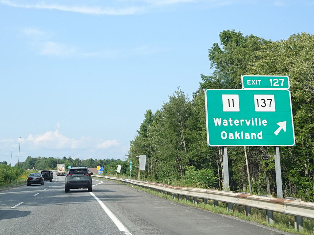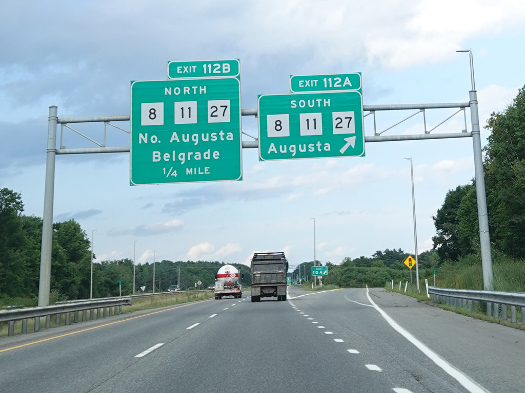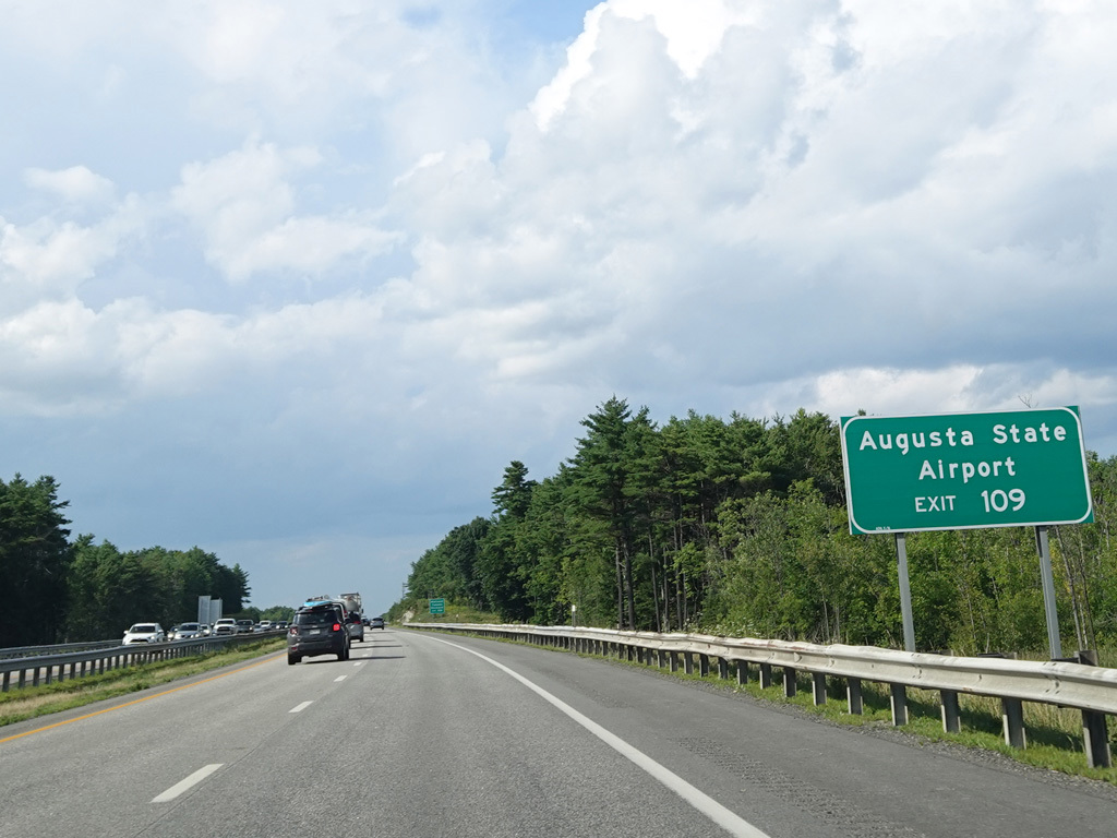 Exit 109 is for Western Avenue (US 202/ME 11/ME 17/ME 100). The Maine Turnpike ends at this point. I-95 continues straight ahead as a free highway from here to the Canadian border.