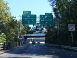 The ramp onto the Thruway from US 9W in Nyack splits. Bear right to go north or left to go south. Motorists getting onto the Tappan Zee Bridge pass under a temporary gantry for cashless tolling. The toll will ultimately be moved back to the other side of the river once the bridge reconstruction is complete.