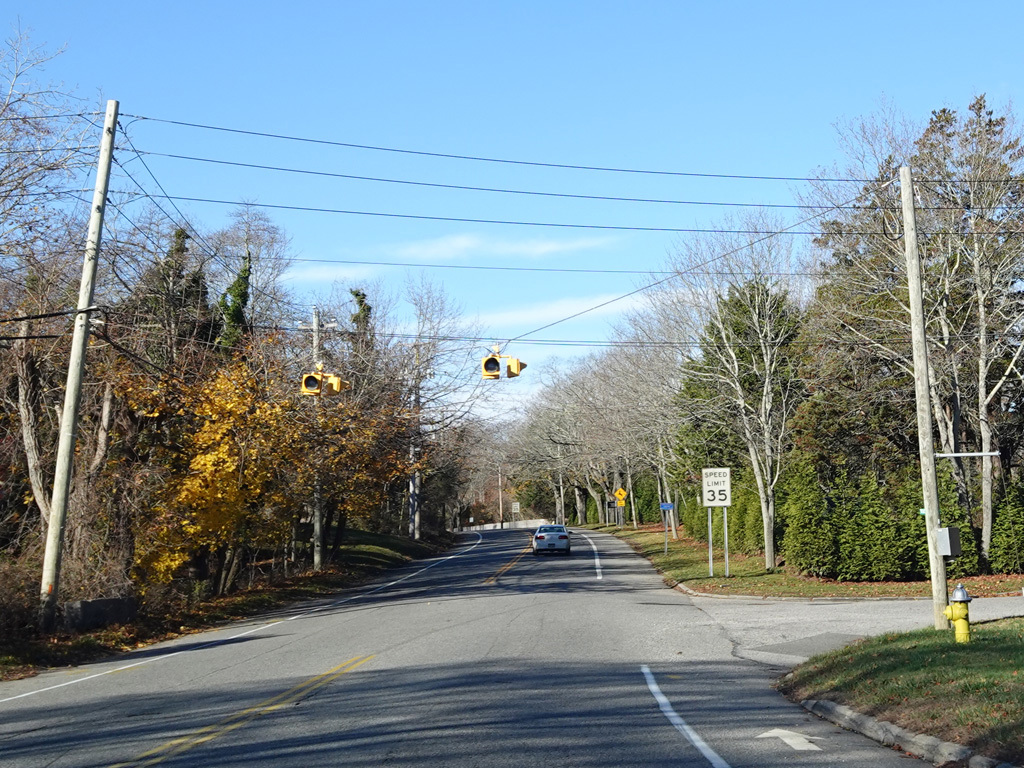 Hill Street becomes Montauk Highway at a flasher at Tuckahoe Lane in Southampton. Here, Montauk Highway is an unsigned state route with NY 27A reference markers.