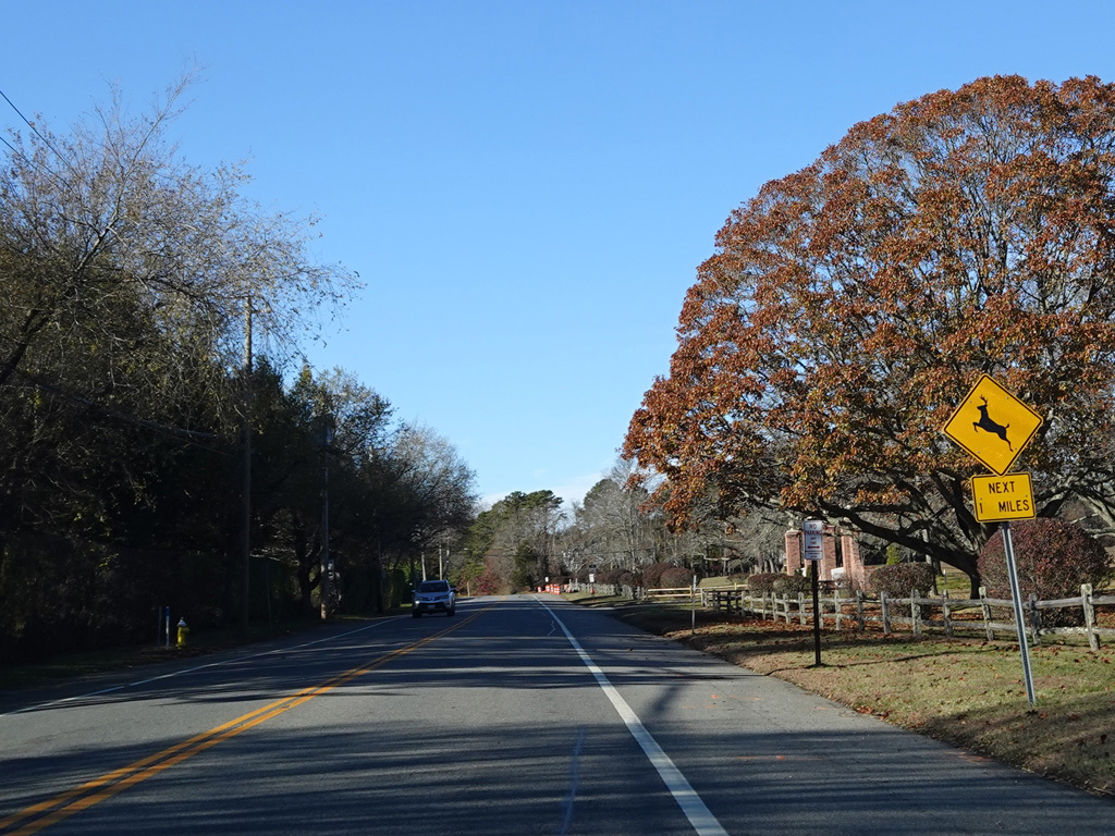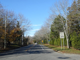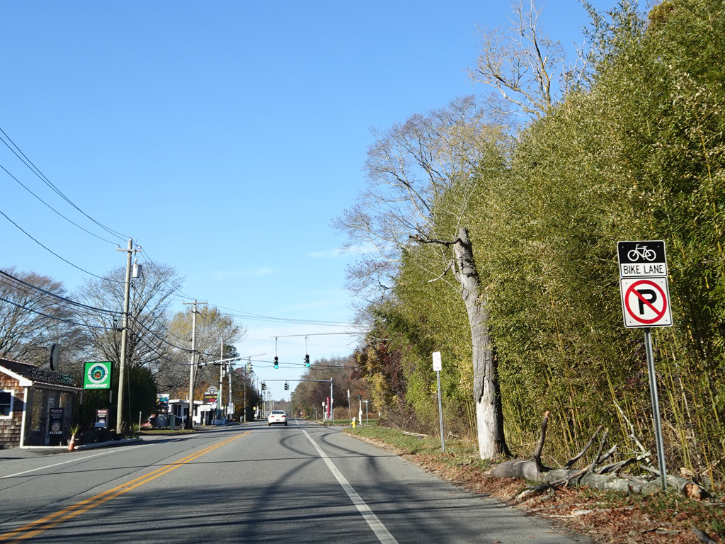 Montauk Highway runs west as a two-lane undivided road. The Shinnecock Nation is on the left here.