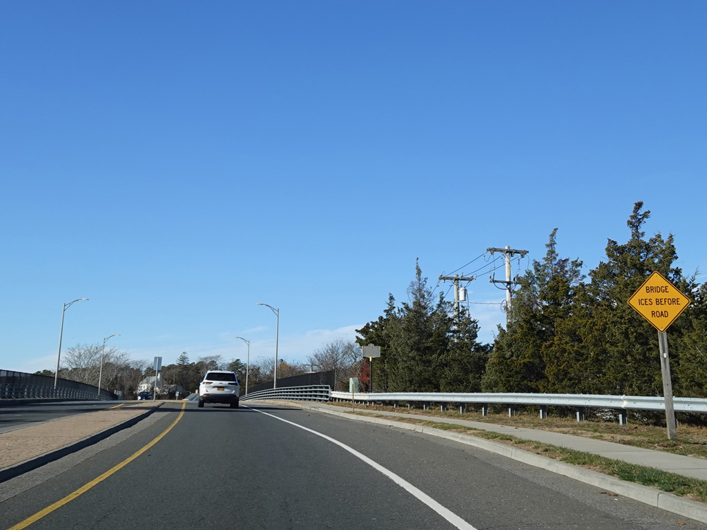 Montauk Highway widens to become a divided highway in the area of the Shinnecock Canal. North Road (CR 39) begins on the right.