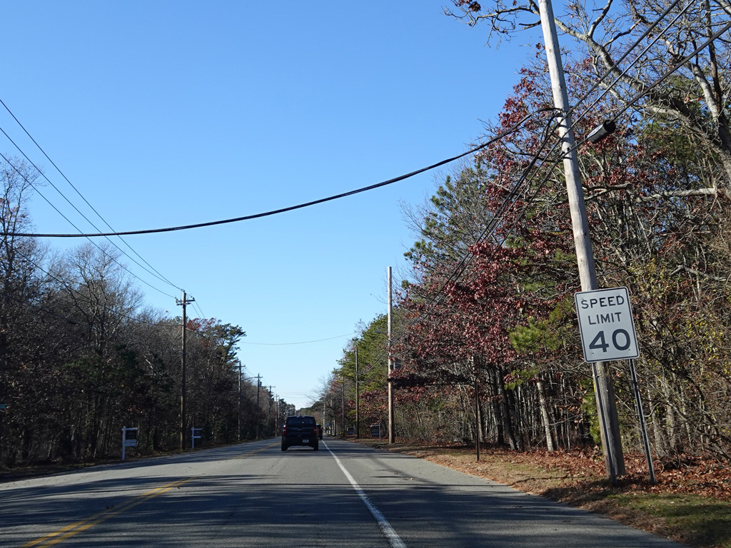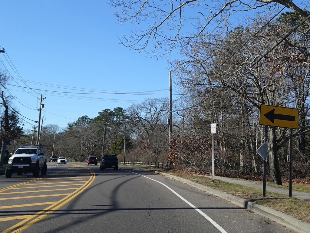 The median ends. Montauk Highway runs west toward Hampton Bays at a two-lane undivided road.