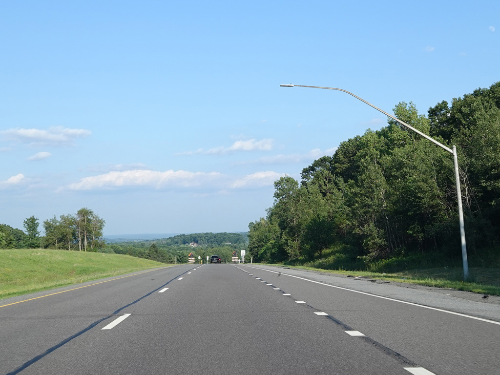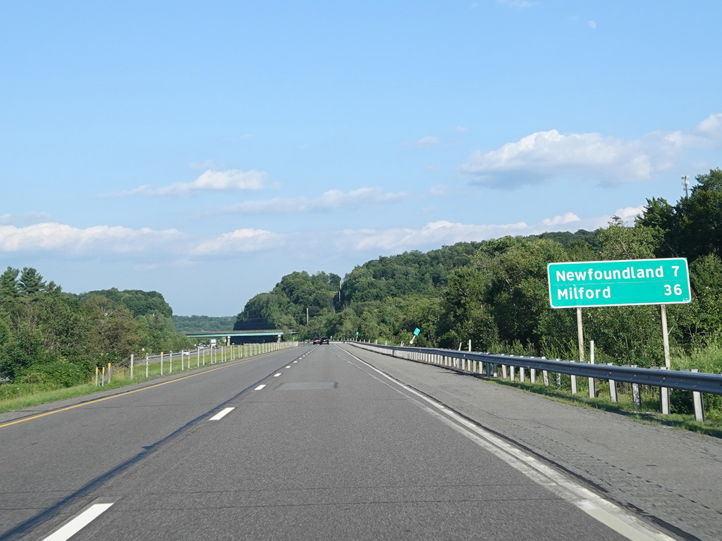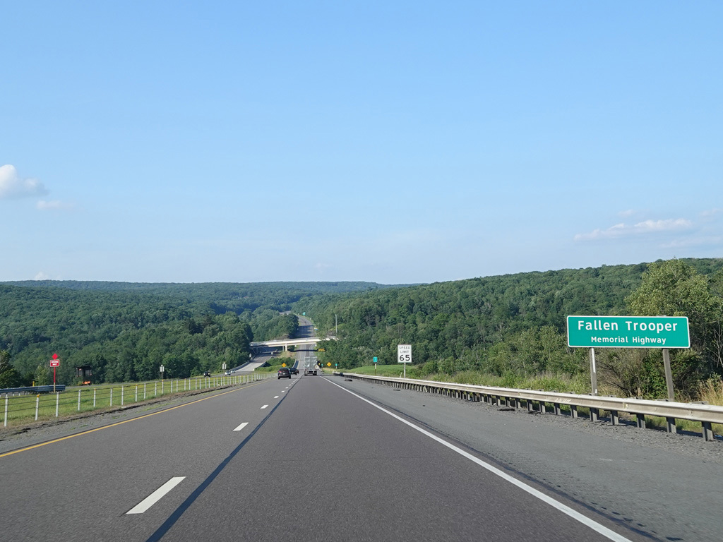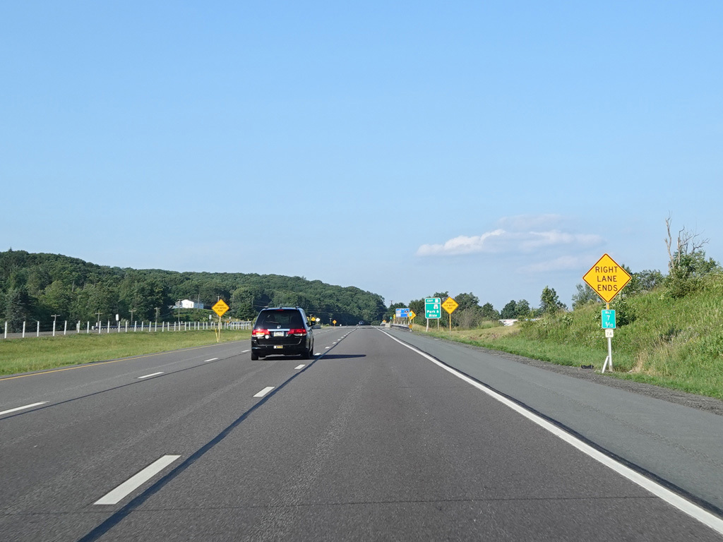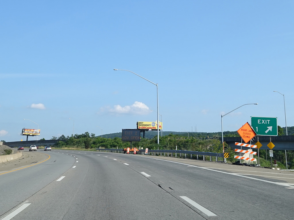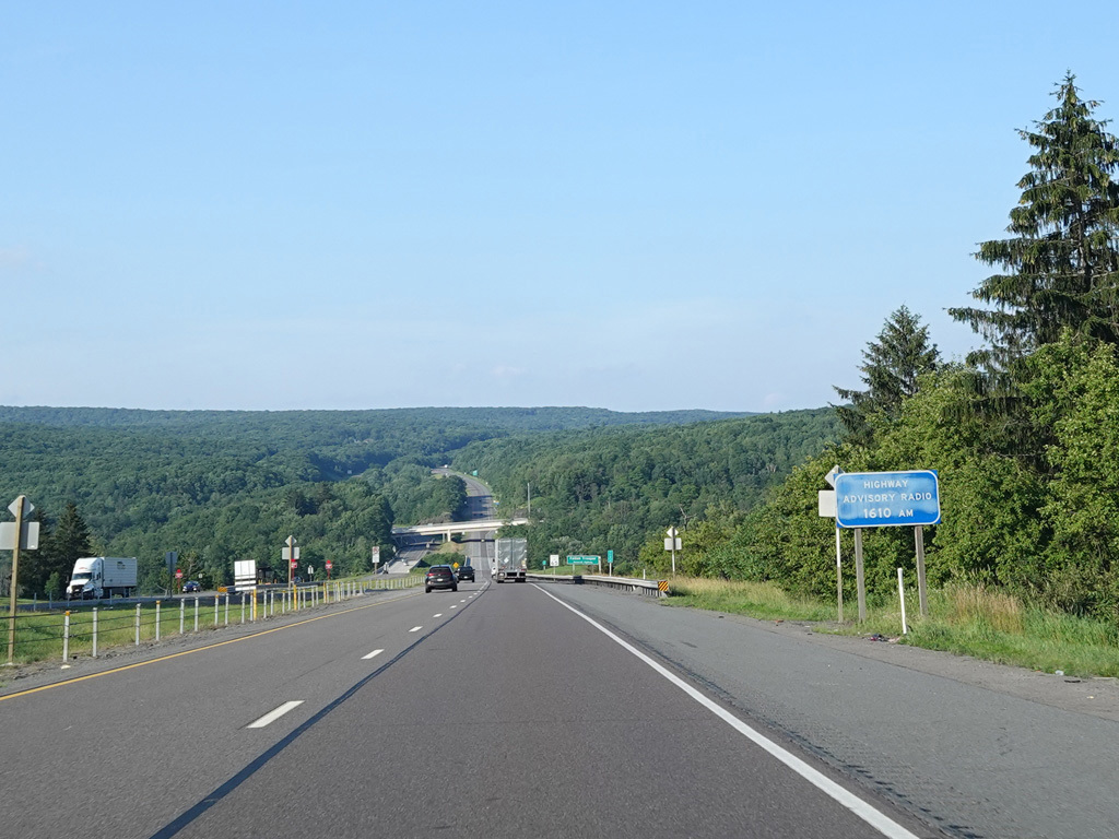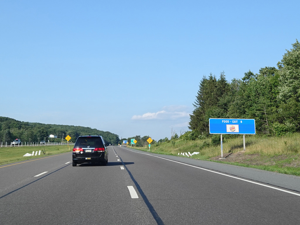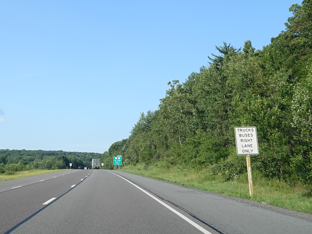 East of exit 4, there is a third northbound lane as the highway goes uphill. Exit 8 is for PA 247 and Mount Cobb Road (PA 348).