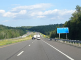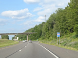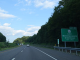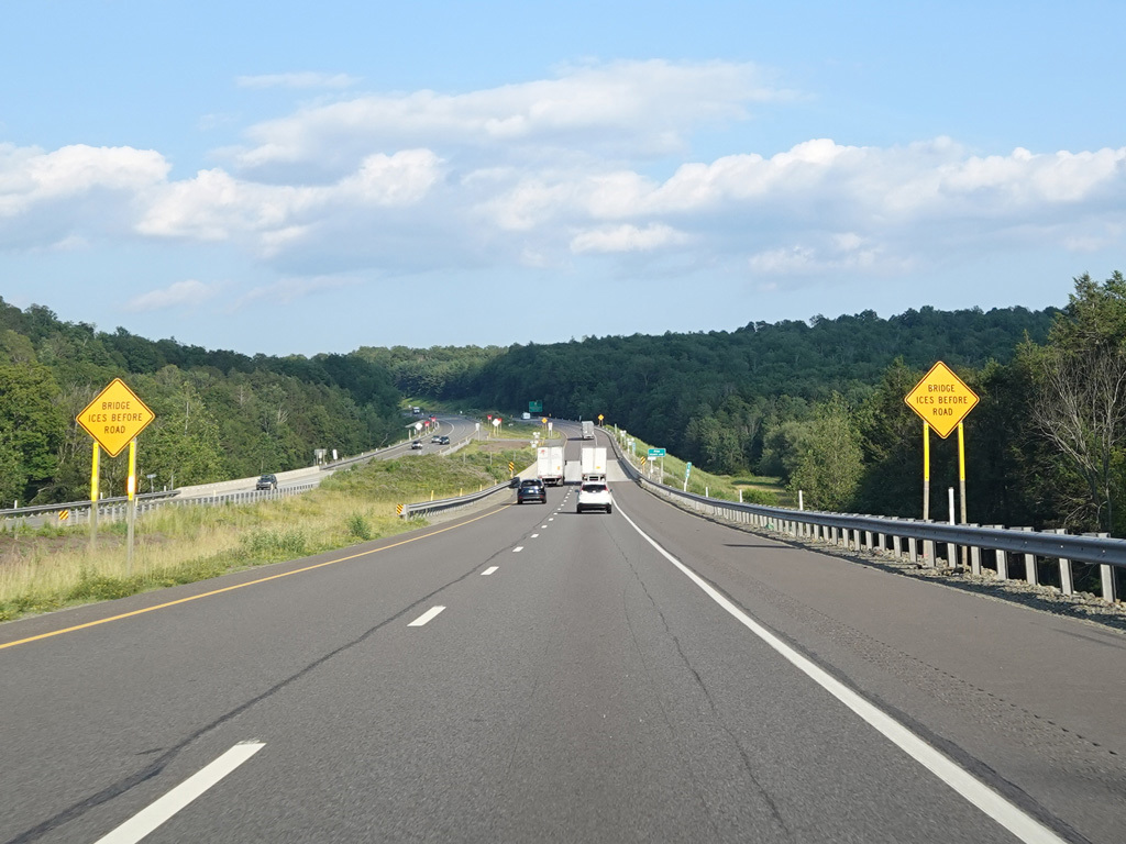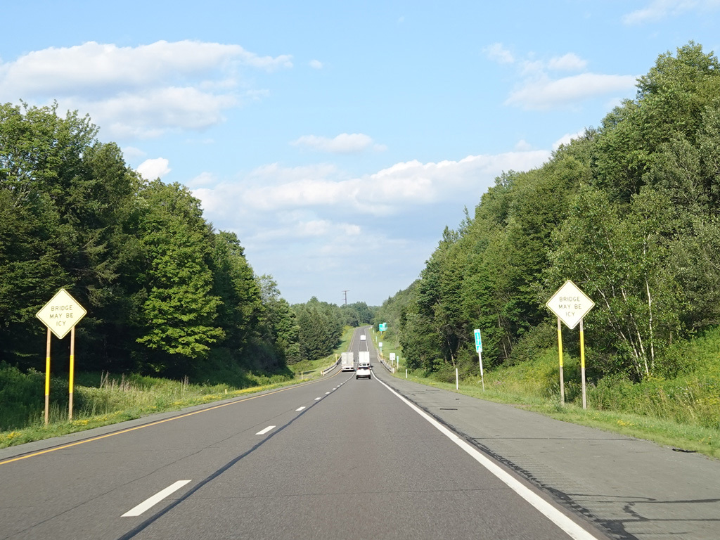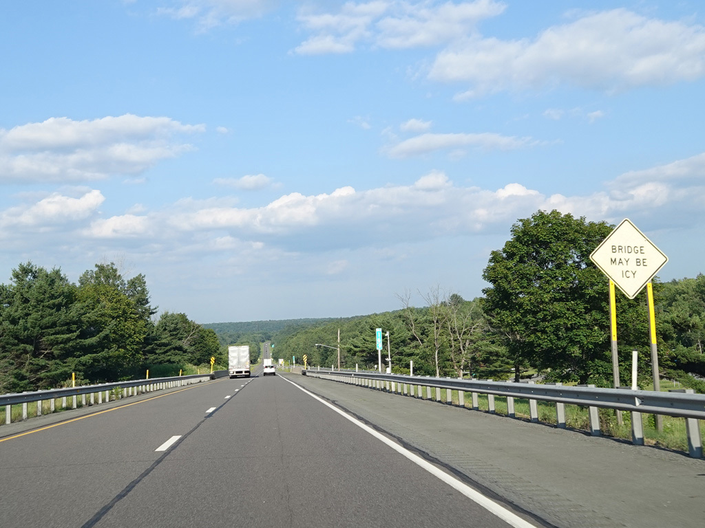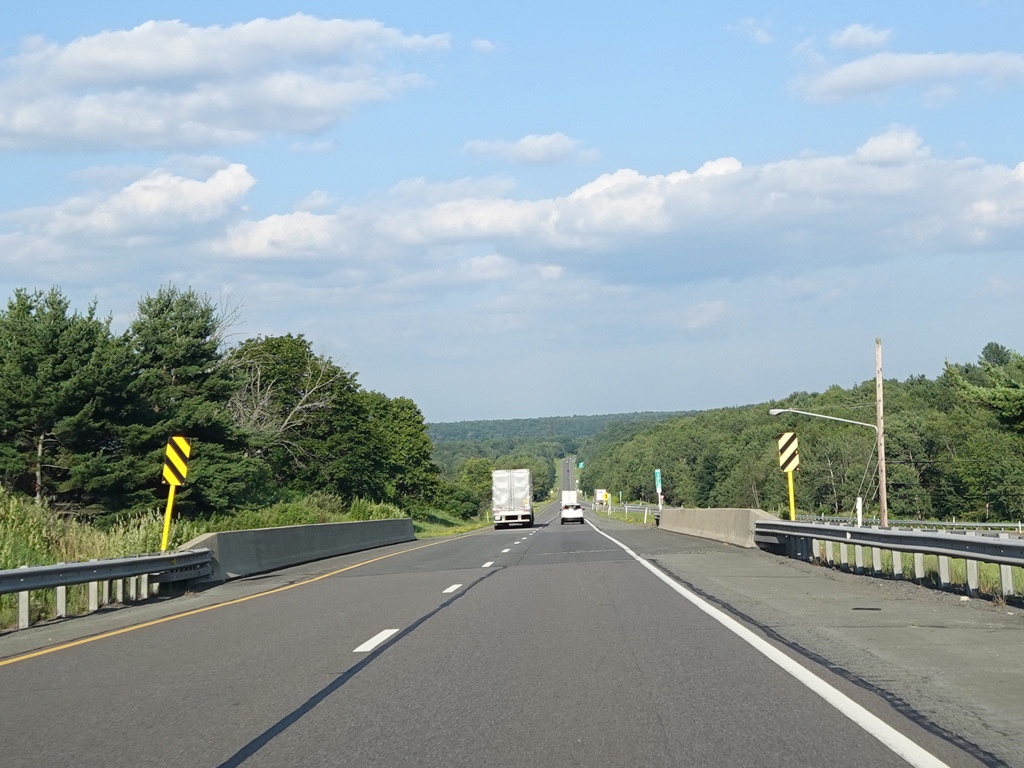 Approaching the state line, there is advance signage for exit 1 in New York, which is for US 6 and NJ 23. The sign is in Pennsylvania, the exit is in New York, and it references a state route in New Jersey. Straight ahead, there is a bridge over the Delaware River to New York.
