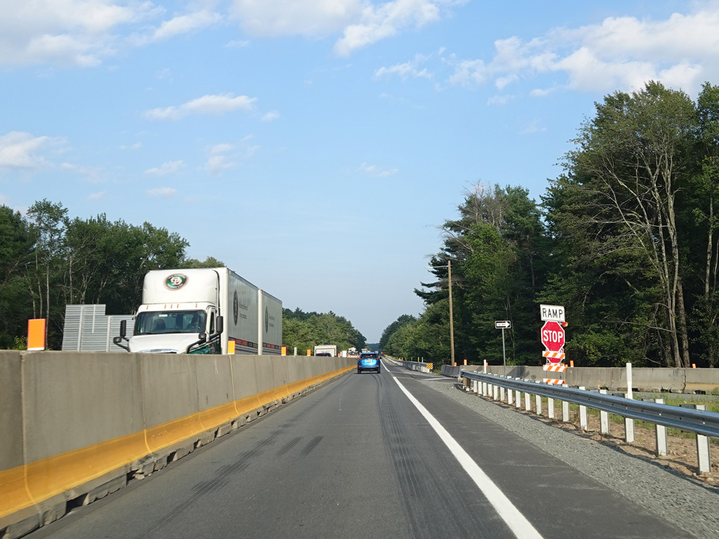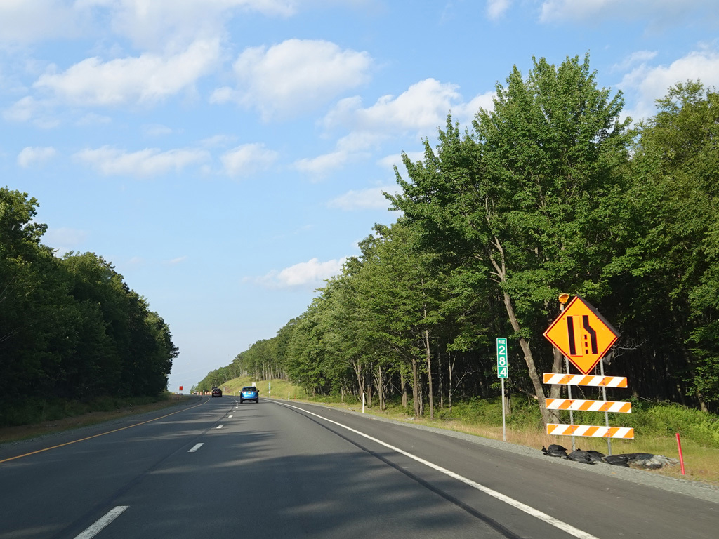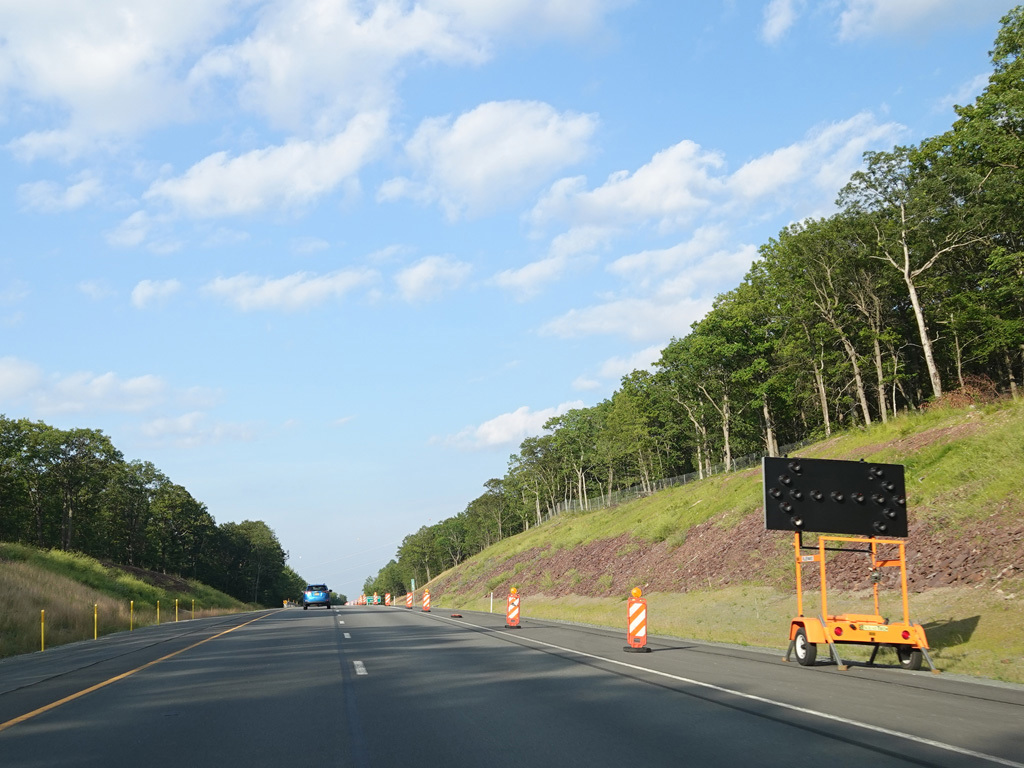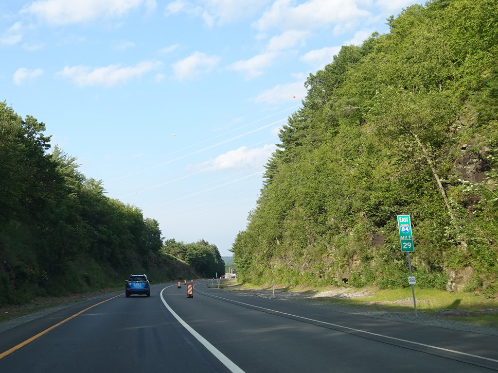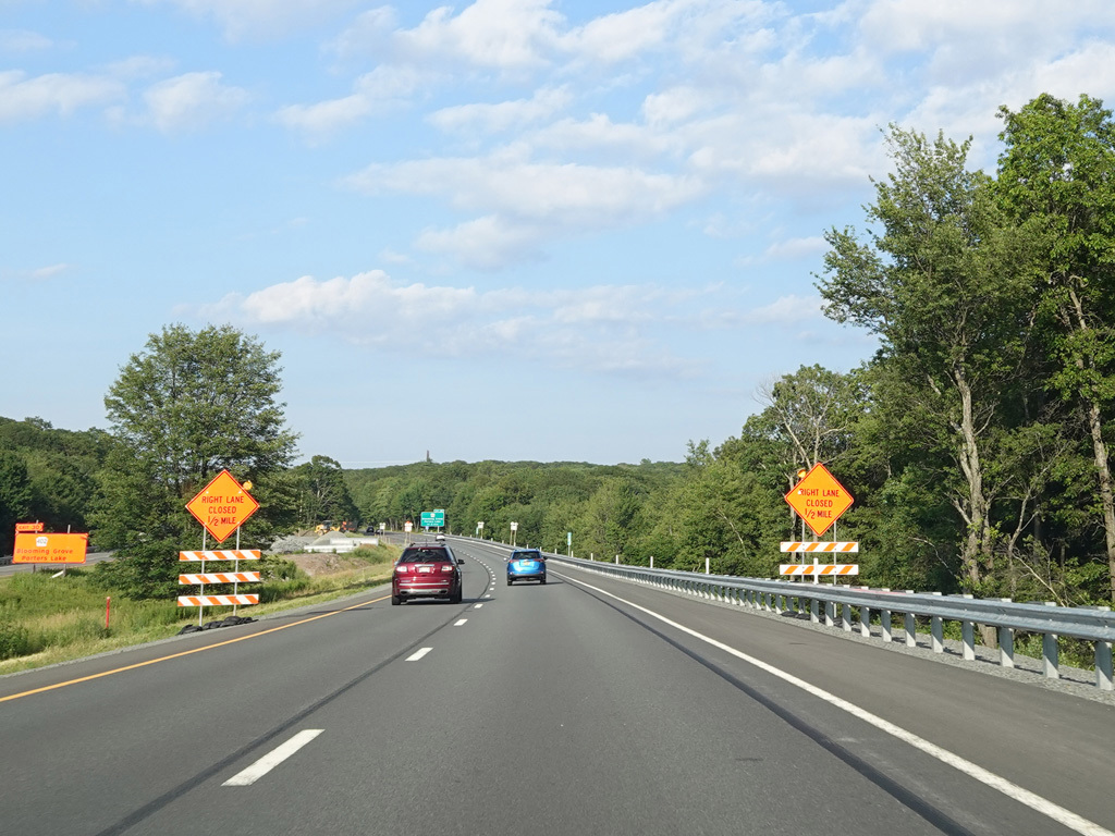 Exit 34 is for PA 739. Due to construction, all traffic is forced into what are normally the westbound lanes, with one lane for each direction. This arrangement ends just before the exit.