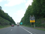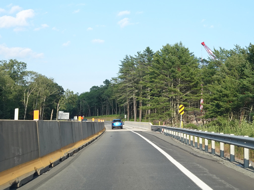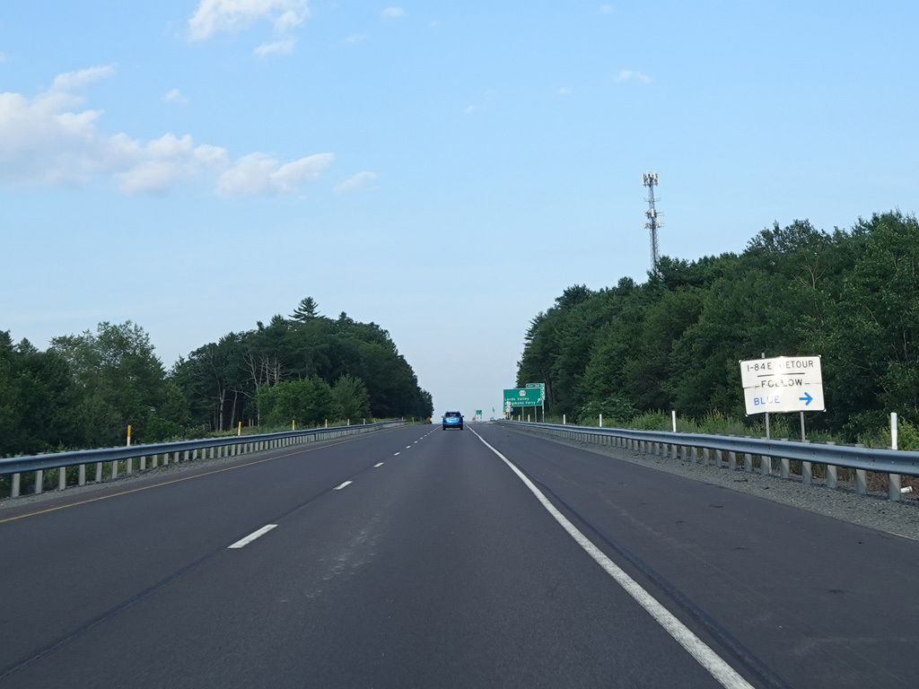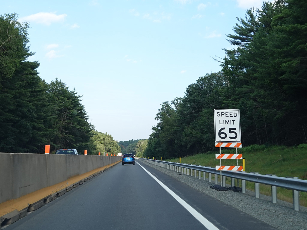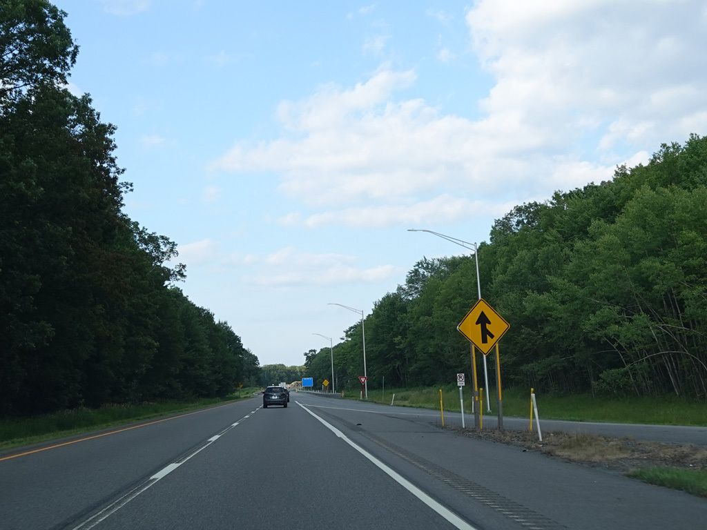 Exit 34 is for PA 739. Due to construction, all traffic is forced into what are normally the westbound lanes, with one lane for each direction. This arrangement ends just before the exit.