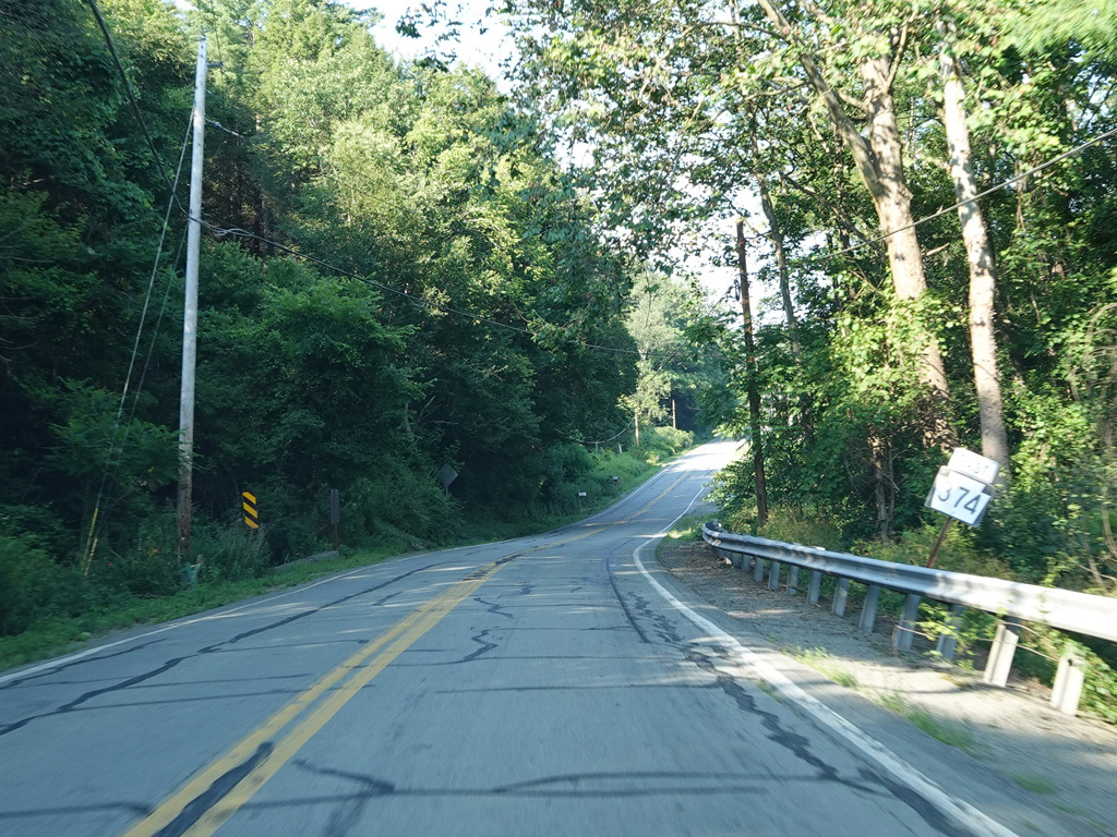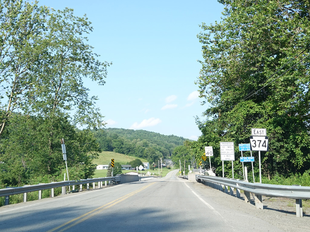 PA 374 begins at PA 92 and runs east as a two-lane undivided road.