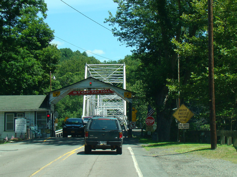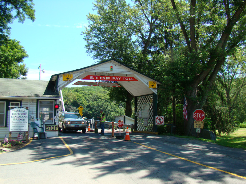 All motorists must pay a toll of $2.00 before crossing the Dingmans Bridge. Not only is E-ZPass not accepted for this toll, they don't even have separate toll lanes for eastbound and westbound traffic. There's just one guy who stands in the middle of the road and takes a dollar from each motorist passing by.
