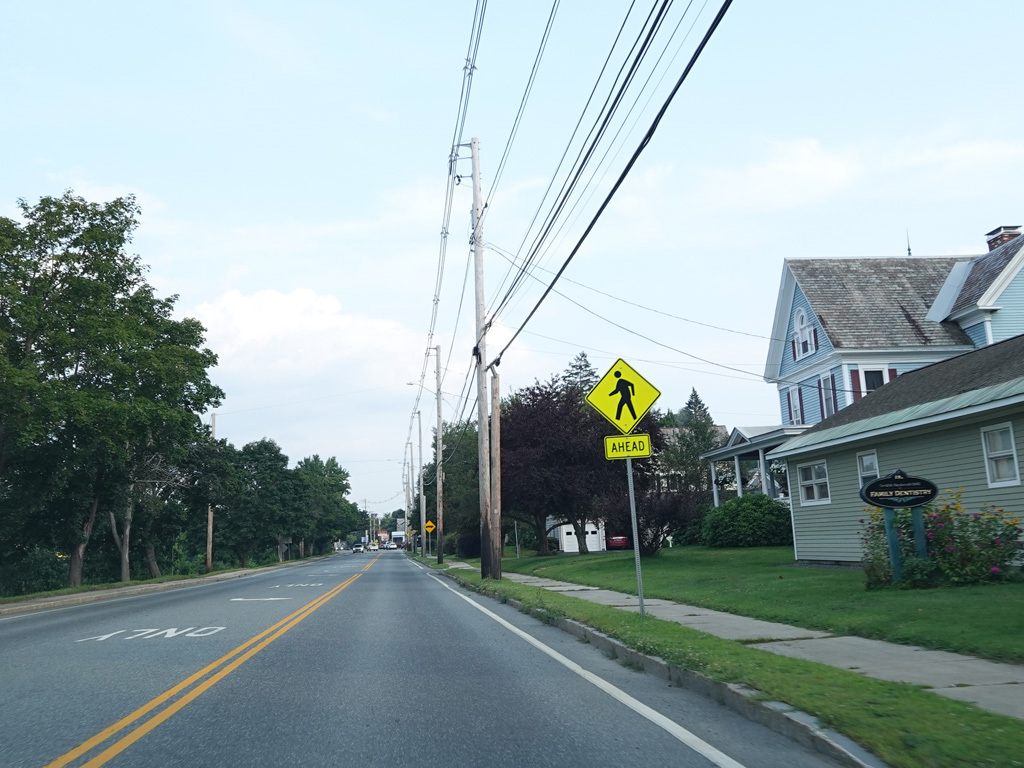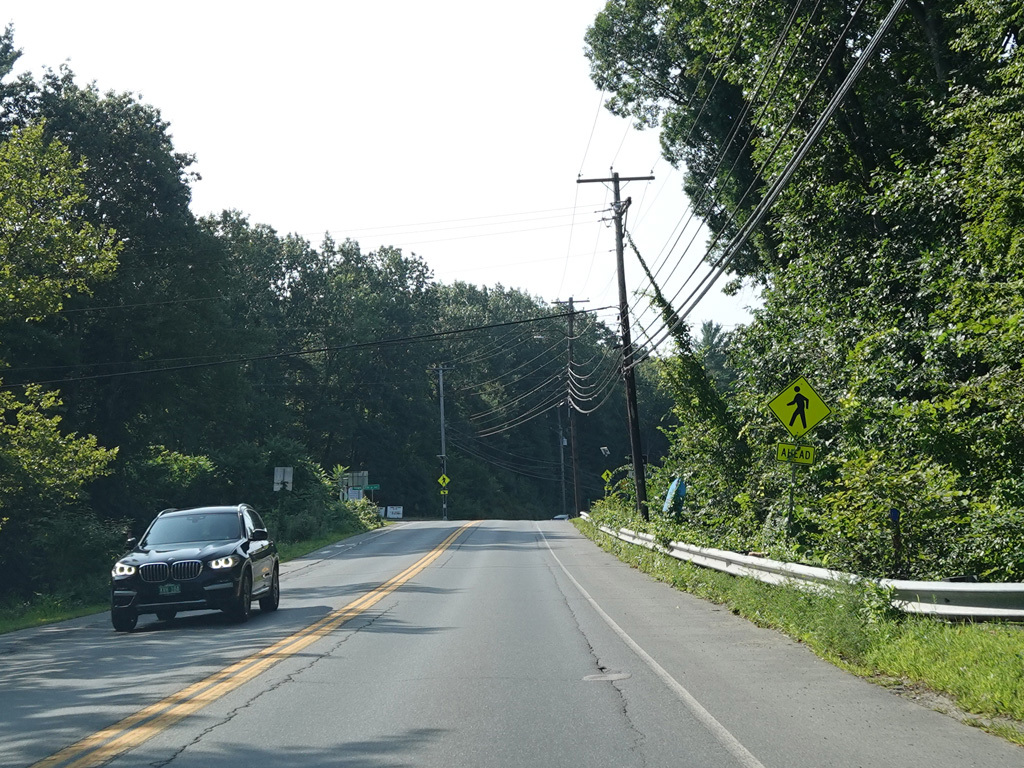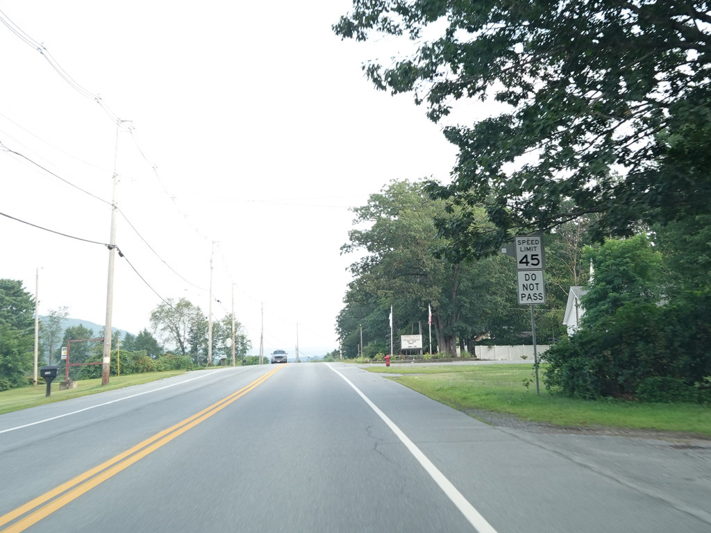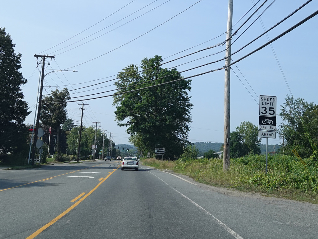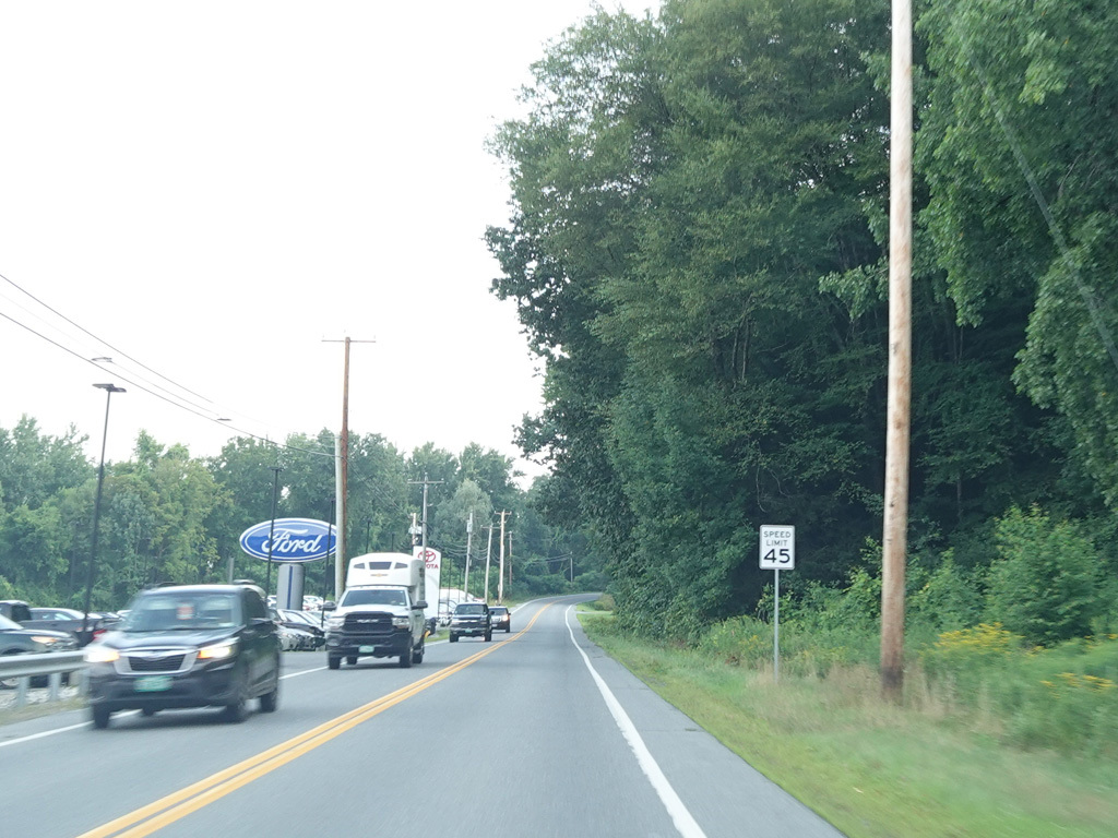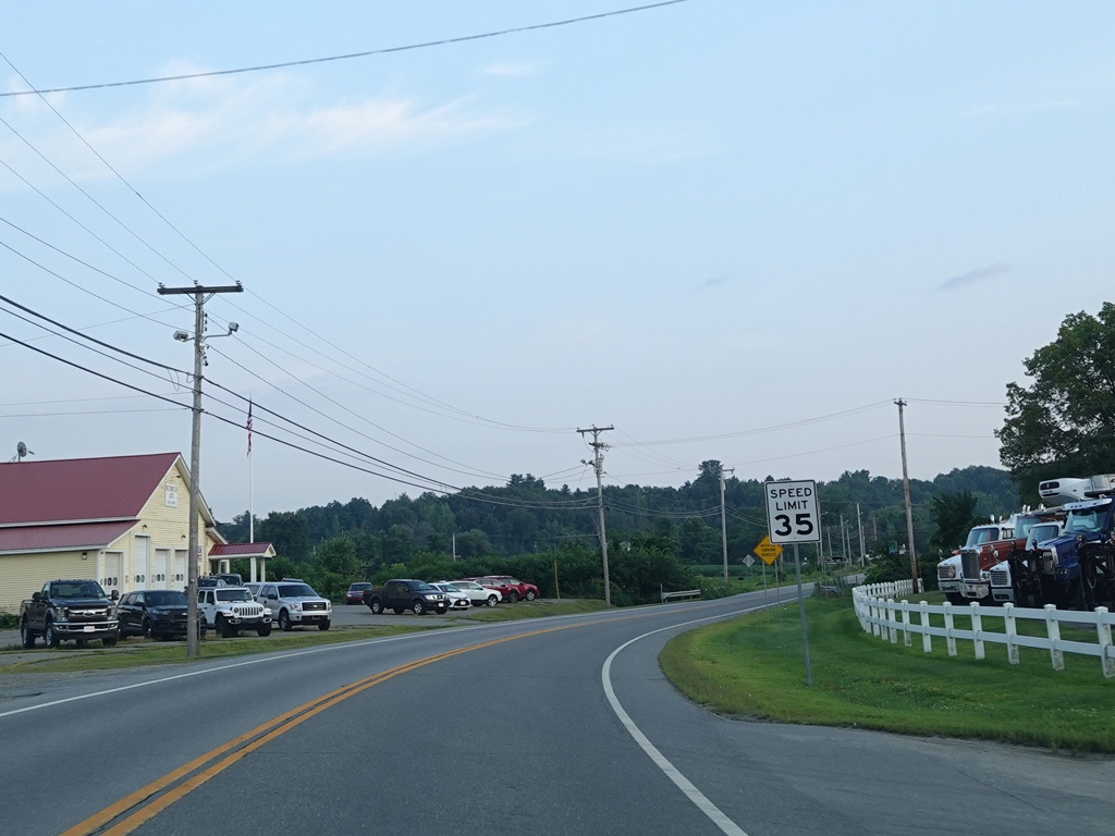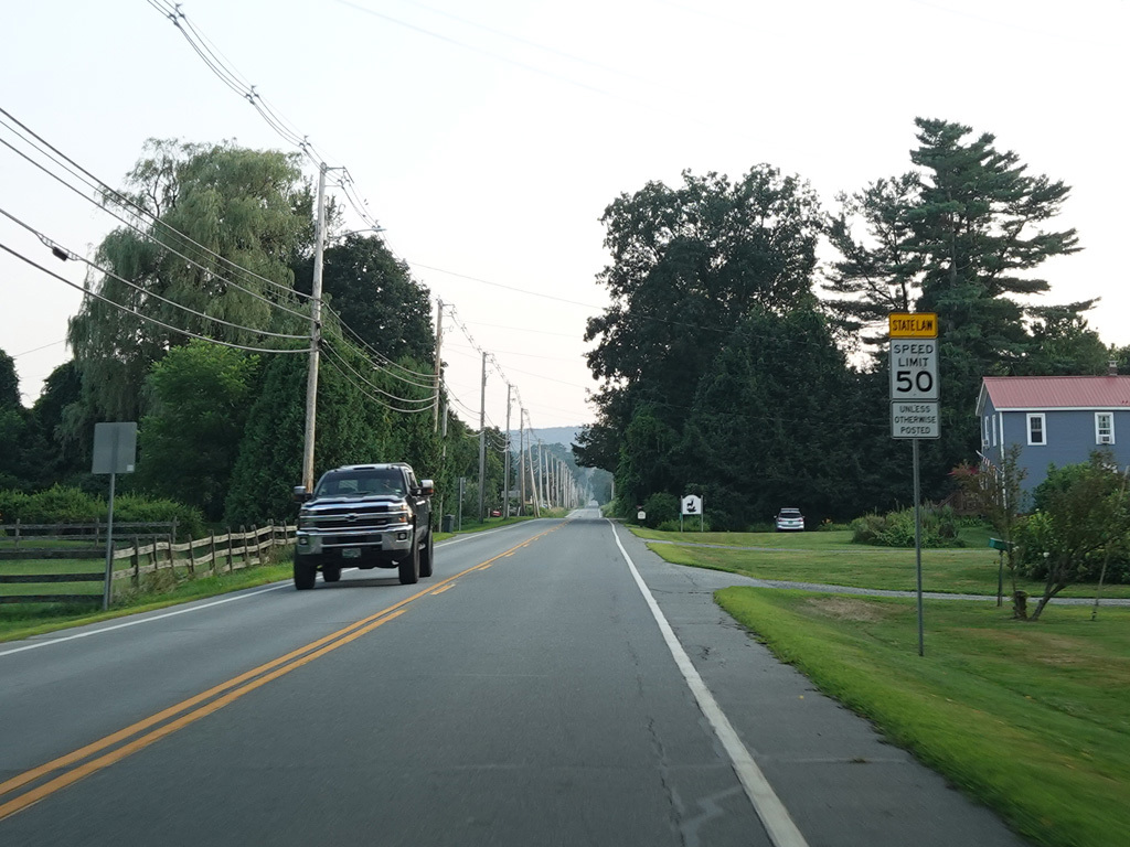 Coming into Putney, Bellows Falls Road changes names to become Main Street. The speed limit drops to 40 MPH and then to 30 MPH.