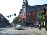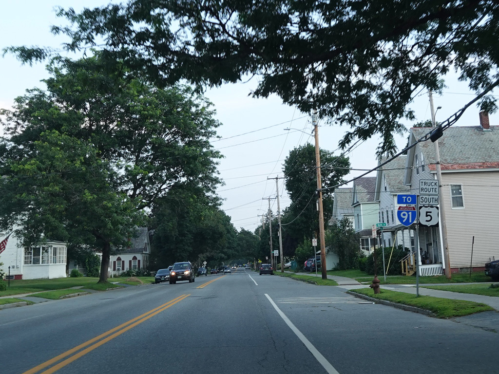 Rockingham Street splits off to the left as a local street. Bear right onto Atkinson Street to stay on US 5. The signage here is slightly misleading here, making it look like Atkinson Street is a truck route of US 5, rather than US 5 itself.