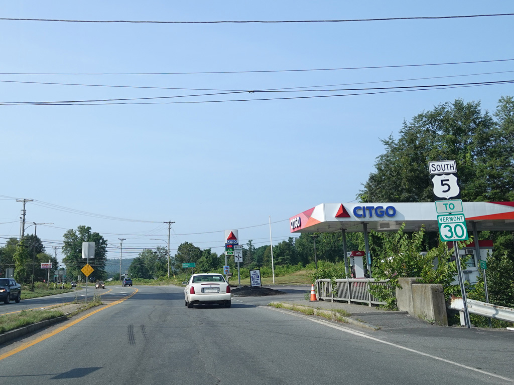 There is a roundabout at Chesterfield Road (VT 9). Westbound VT 9 is multiplexed with US 5 straight ahead, although the signage does not indicate so. There is also an entrance to I-91 at this roundabout.