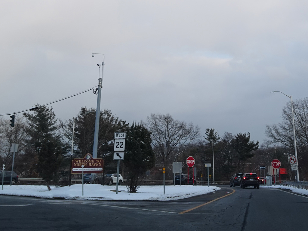The ramp for exit 11 when travelling north splits. Bear right to go east on US 5/CT 22. The two routes are multiplexed here, but only CT 22 is indicated on the signs.