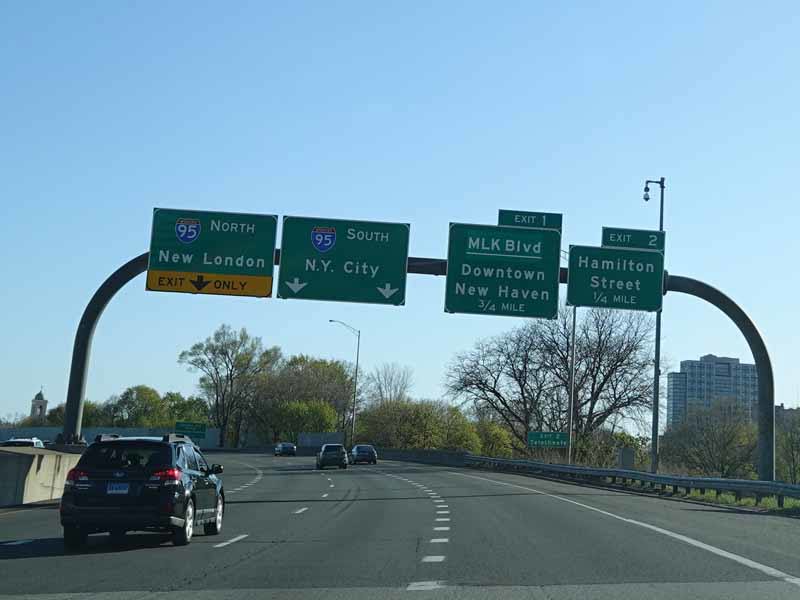 Exit 1 is for Martin Luther King Boulevard (CT 34) west. I-91 ends here at the Connecticut Turnpike (I-95). Bear left to go north or bear right to go south.