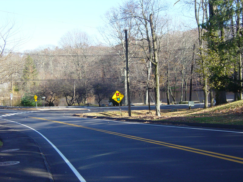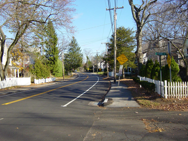 East Avenue ends here at New Norwalk Road (CT 123). Turn left to go north or right to go south. CT 106 continues straight ahead as Silvermine Road.