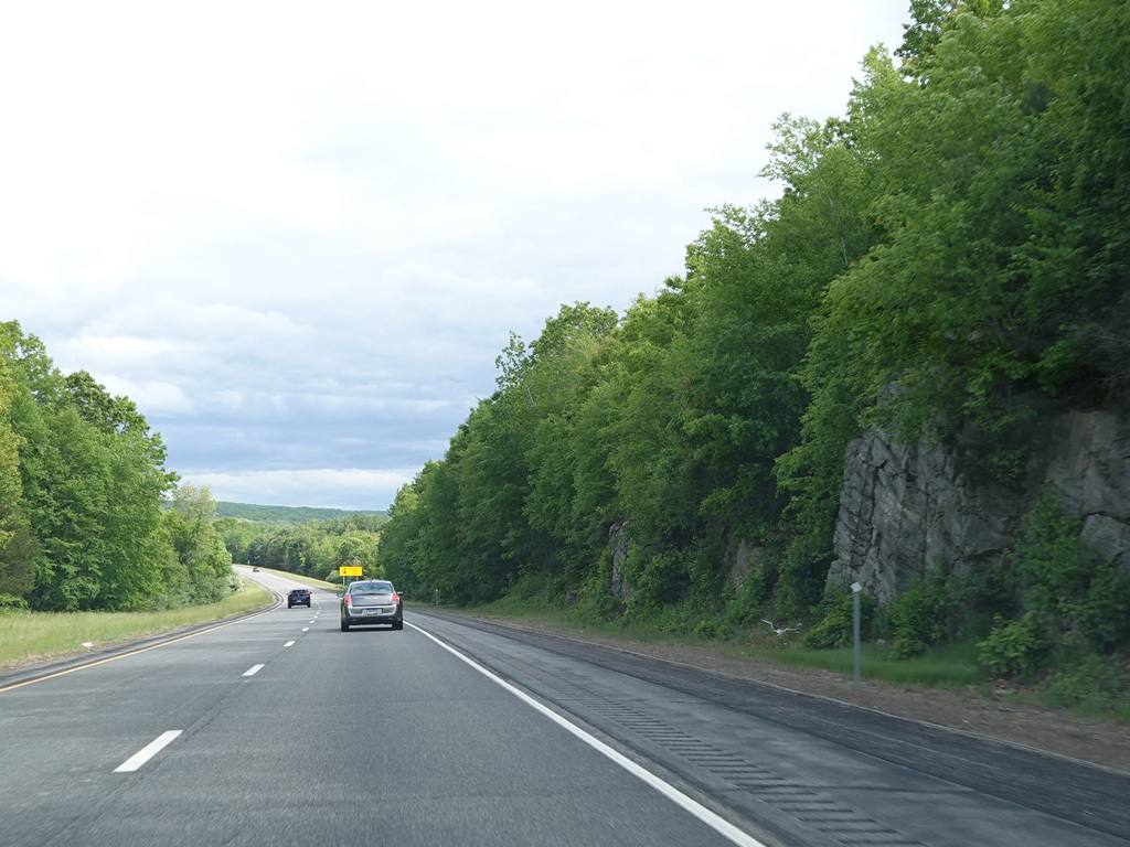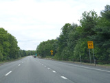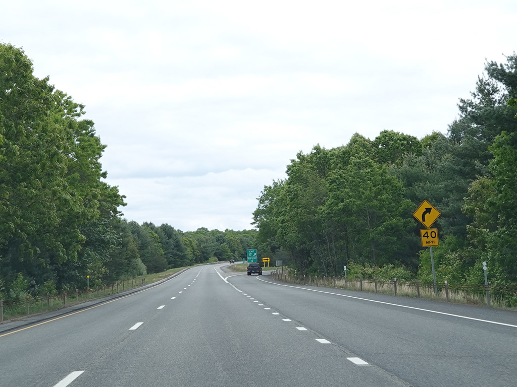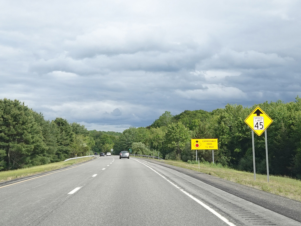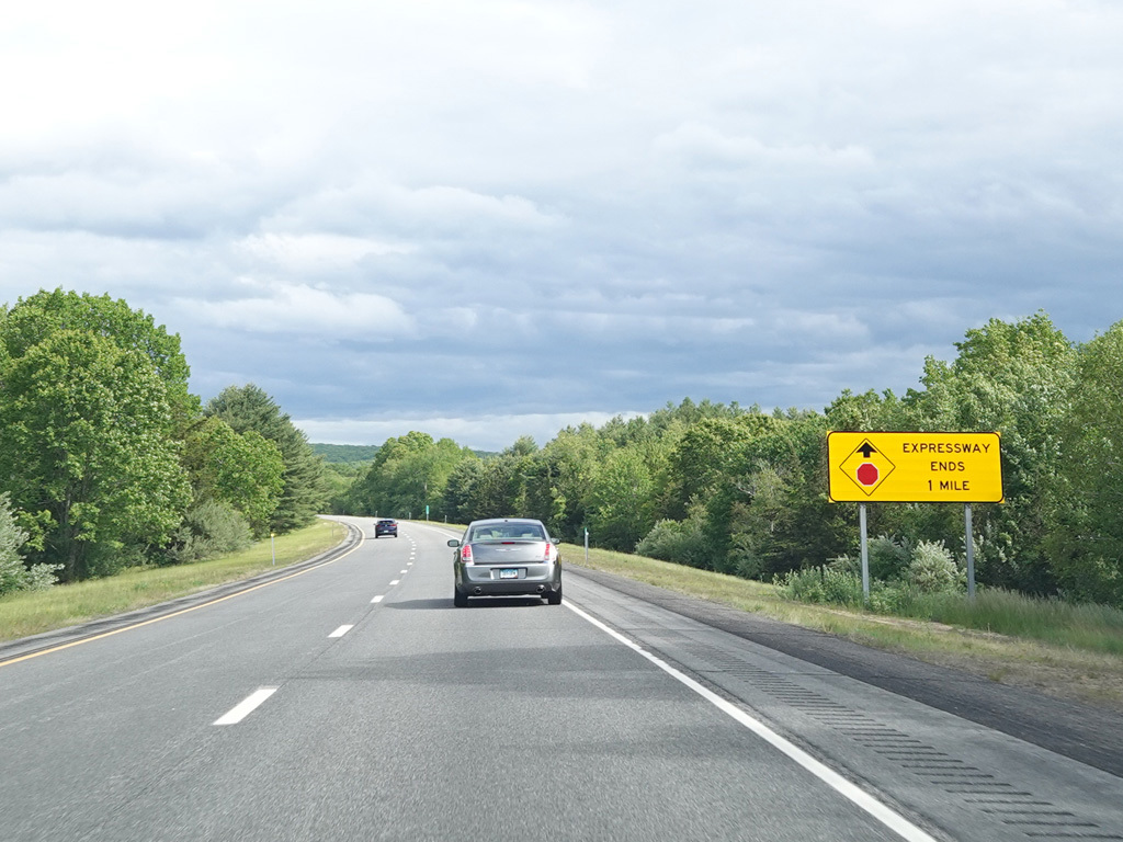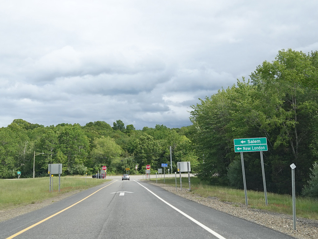 The expressway ends at a flasher and stop sign at East Haddam Road (CT 82). Turn left to go east or right to go west.