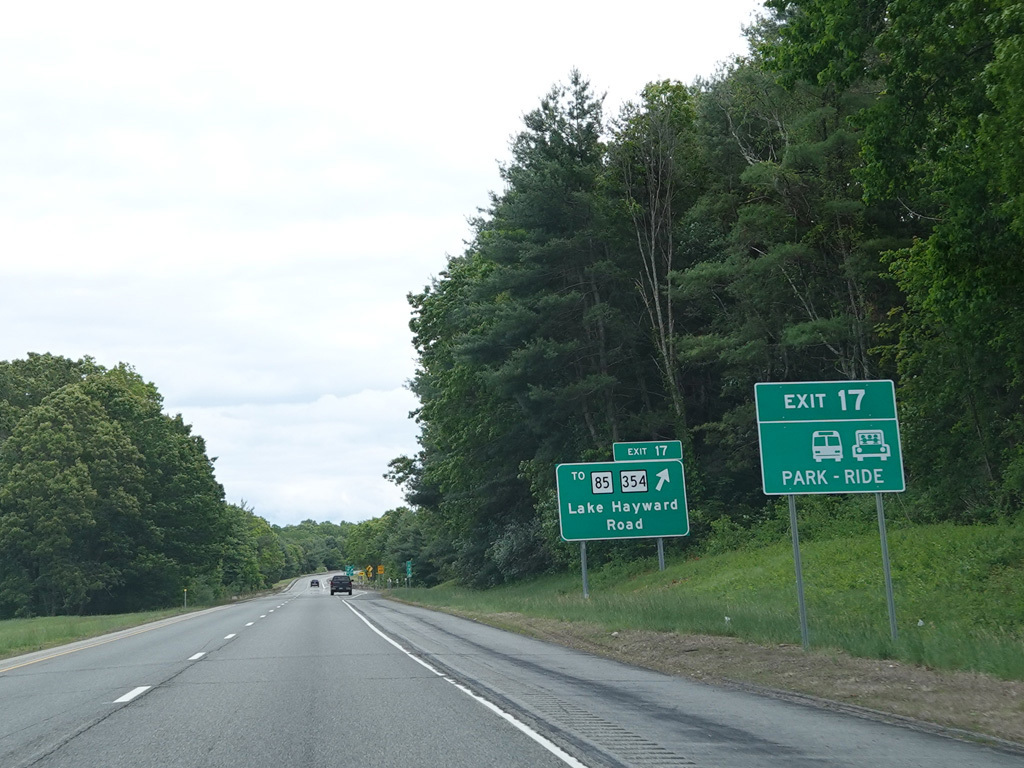 CT 11 begins at the CT 2 expressway in Colchester. Exit 17 is for New London Road (CT 85), Parum Road (CT 354), and Lake Hayward Road (SR 637).