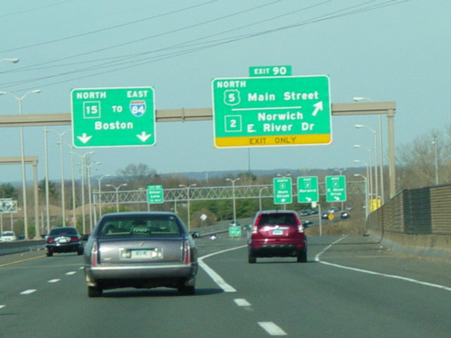 Exit 90 is for Main Street (US 5) north, CT 2, and East River Drive (SR 502). Exit 91 is for Silver Lane (SR 502).
