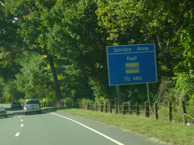 There is a Mobil gas station between exits 46 and 44. Exit 44 is for Black Rock Turnpike (CT 58).