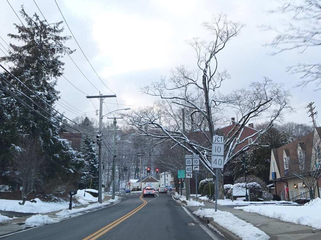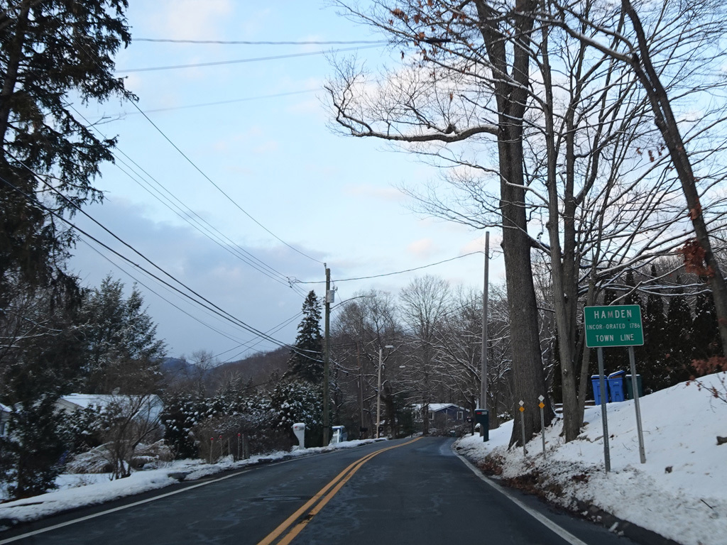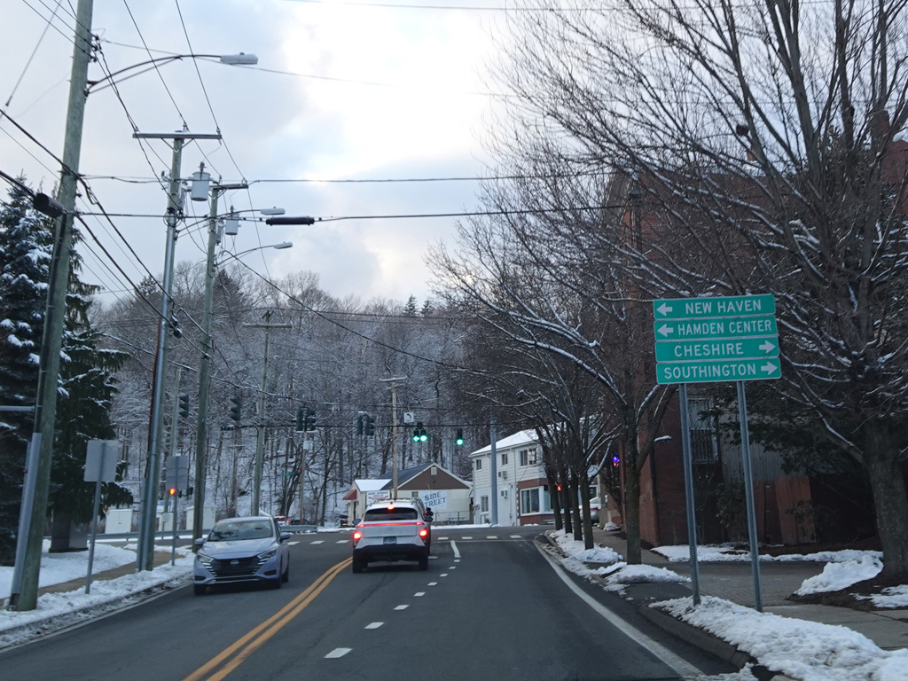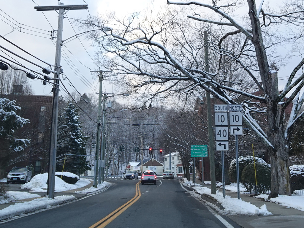 Welcome to Hamden! At the town line, CT 22 changes names yet again to become Broadway. Broadway passes under the Mount Carmel Connector (CT 40). Once again, there is no entrance or exit.