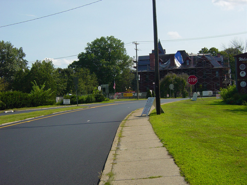 There is a stop sign. Church Street splits off to the left to become a local street. Continue straight ahead onto Meadow Street to stay on CT 63.
