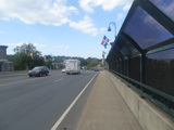 The Thread City Crossing crosses the Willimantic River. On the other side, there is a traffic light at Main Street (CT 66). Turn right to go east or left to go west.