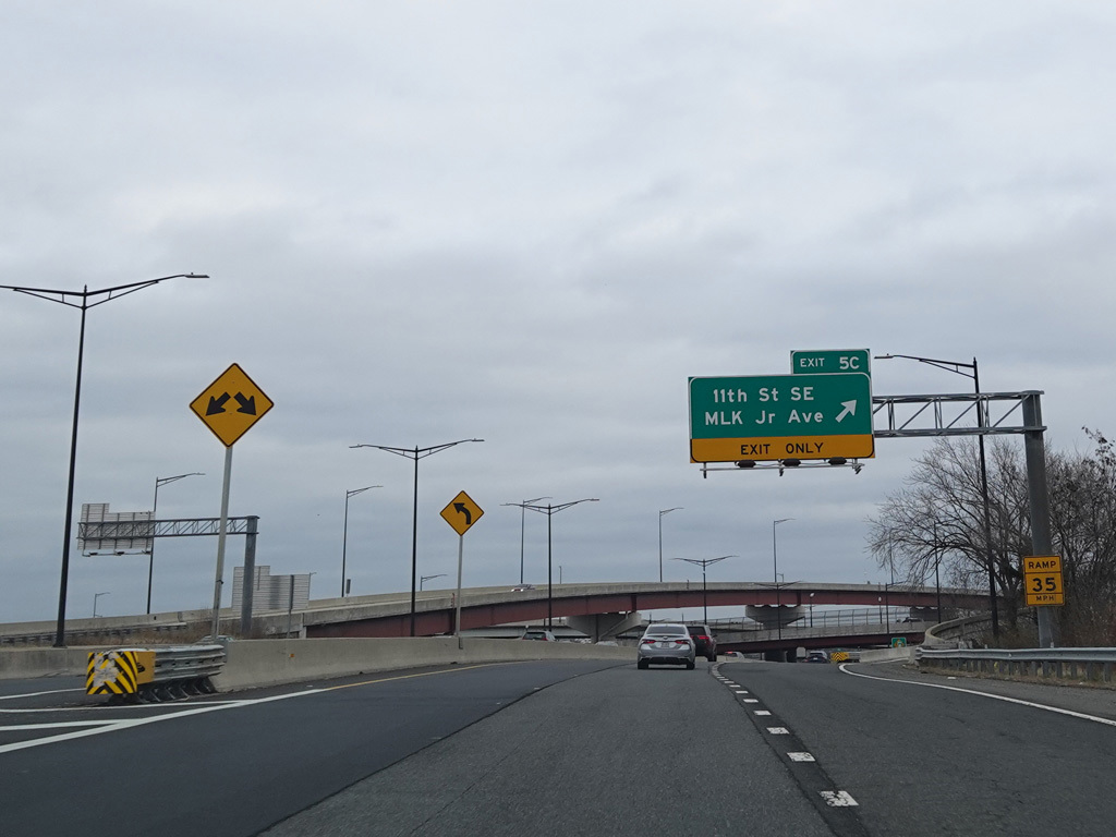 Exit 5A is for the Southeast Freeway (I-695). I-295 ends here. The Anacostia Freeway continues straight ahead as DC 295, which is marked as exit 5B. Exit 5C is for 11th Street SE and Martin Luther King Jr. Avenue.