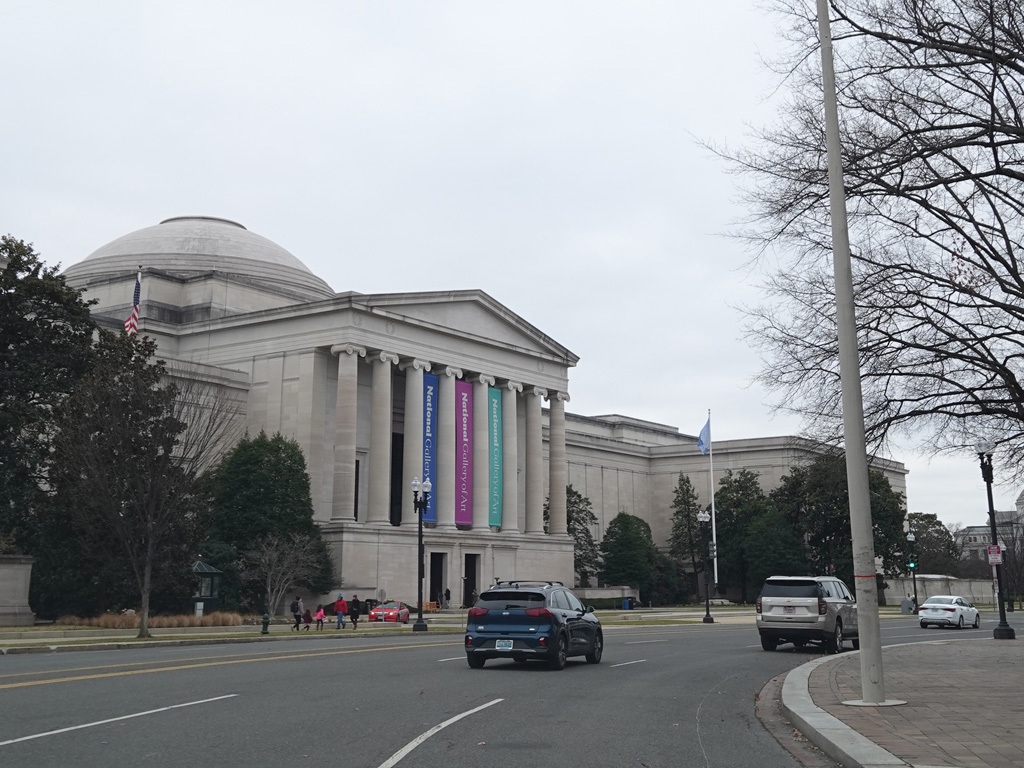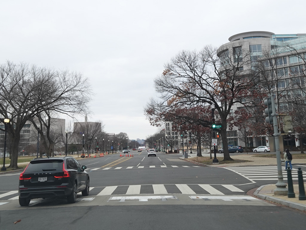 Constitution Avenue runs west as a six-lane undivided road. The National Mall is on the left.