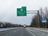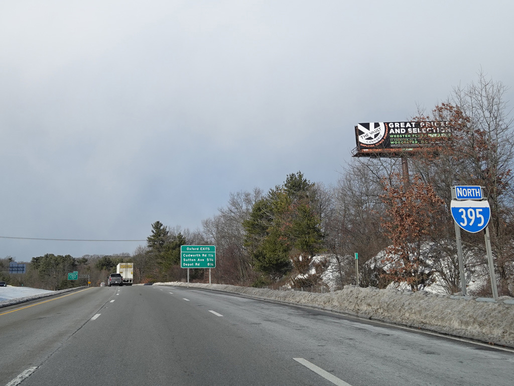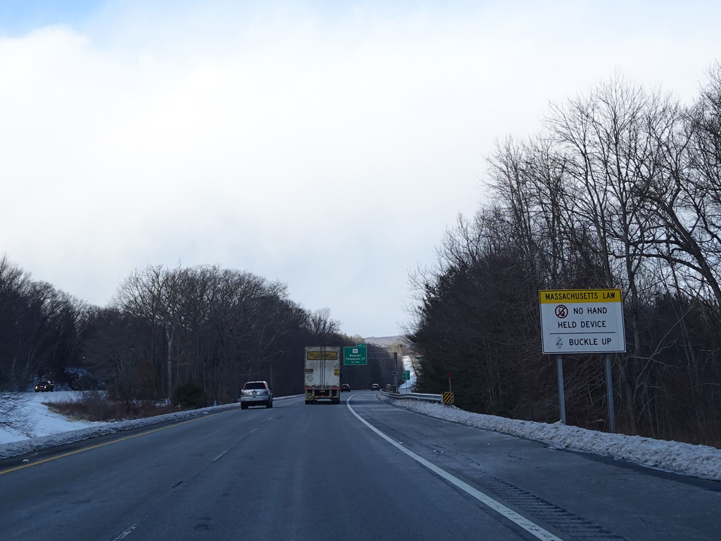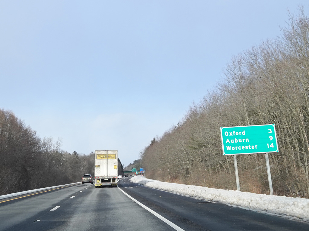 I-395 ends here, changing designation to become I-290. The exit numbers and mileposts from I-395 continues on I-290 straight ahead. There is an advance signage for exit 12, which is for the Massachusetts Turnpike (I-90) and Southbridge Street (MA 12).
