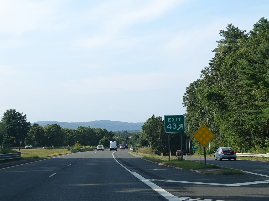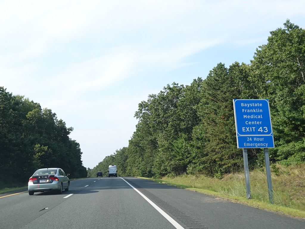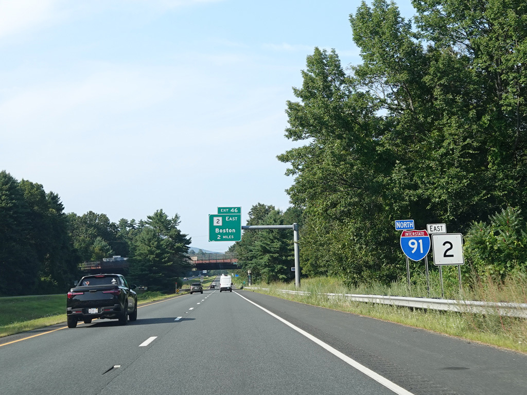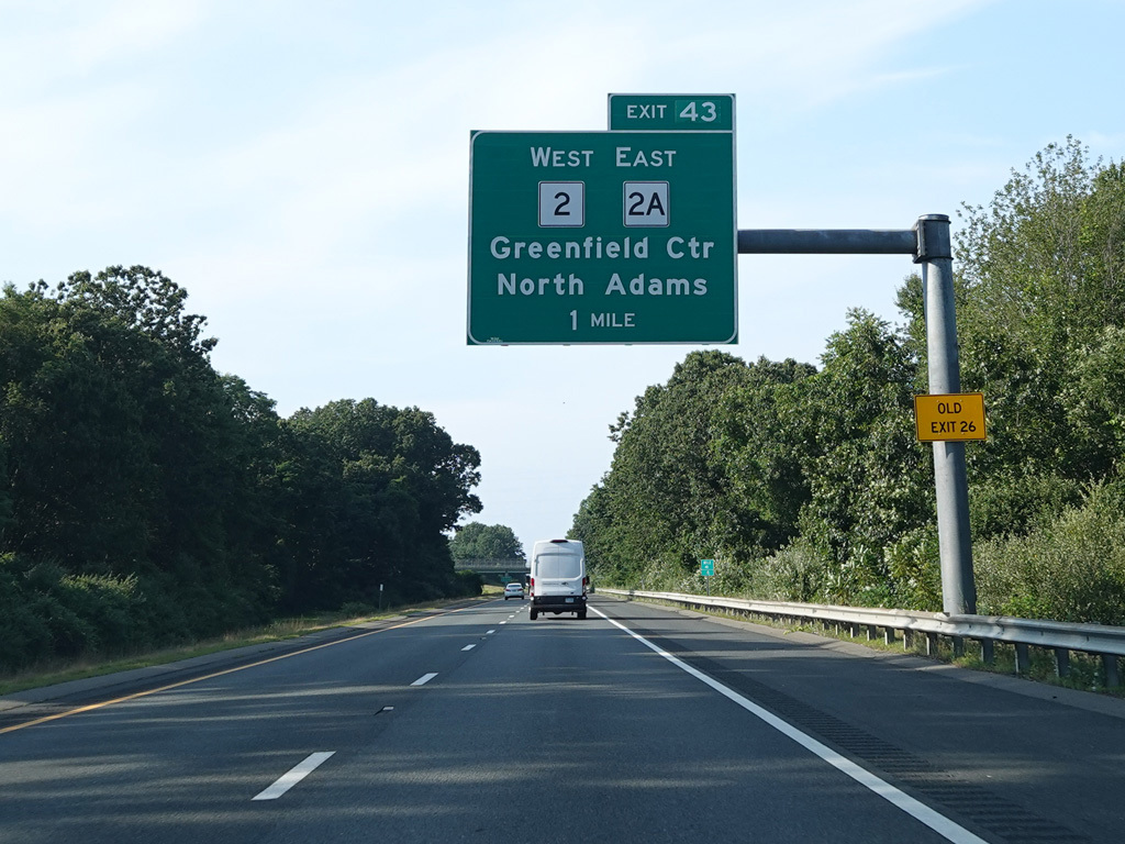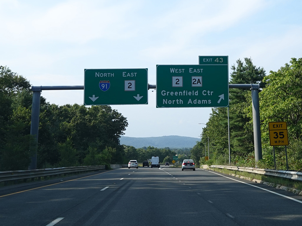 Exit 43 is for Mohawk Trail (MA 2/MA 2A). Eastbound MA 2 is multiplexed with I-91 for one exit straight ahead.