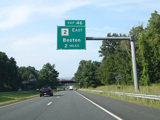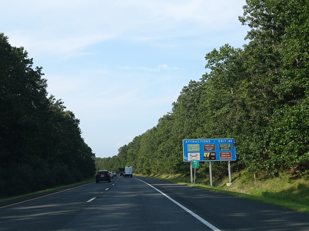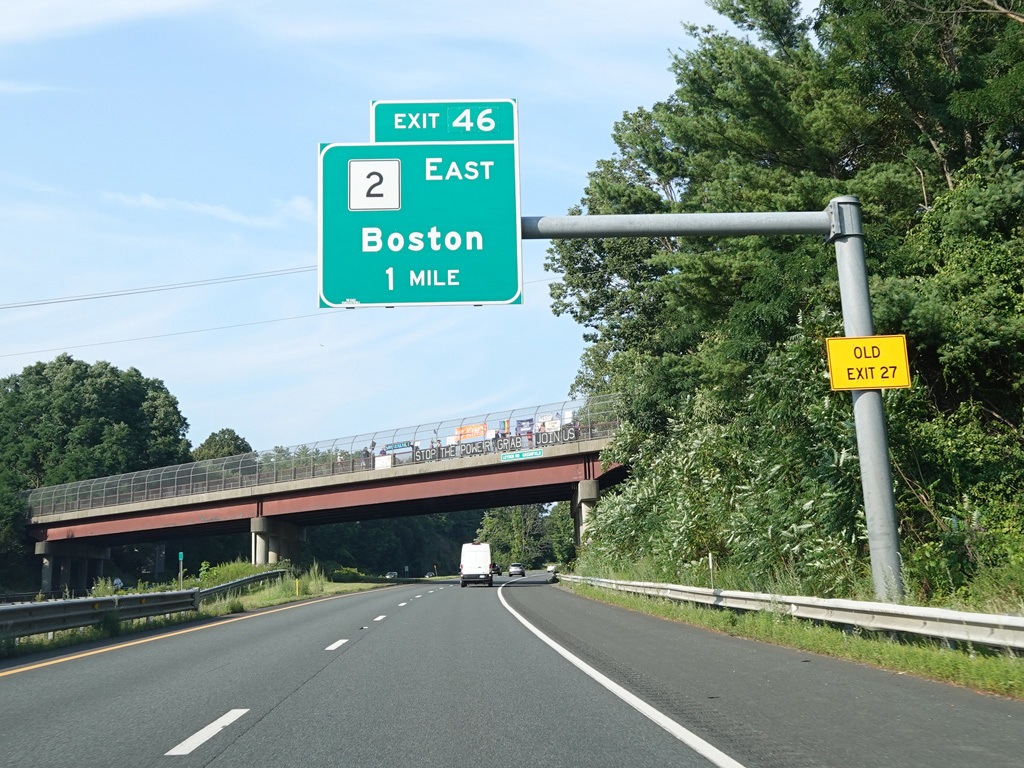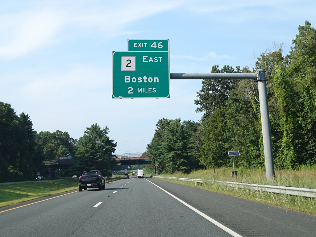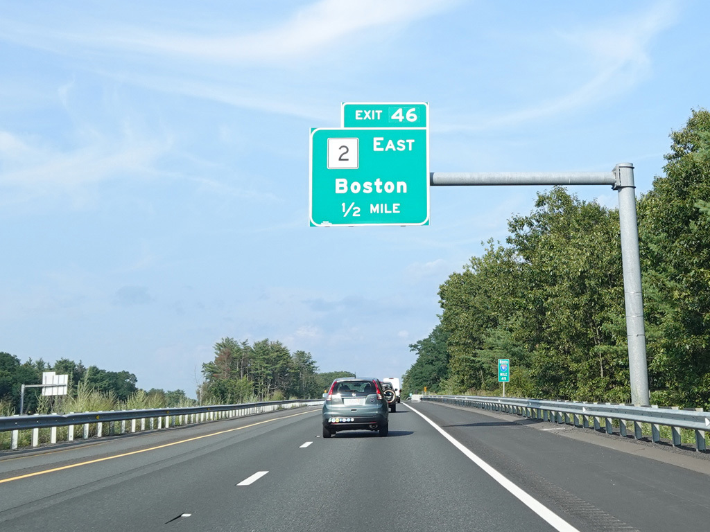 Exit 43 is for Mohawk Trail (MA 2/MA 2A). Eastbound MA 2 is multiplexed with I-91 for one exit straight ahead.