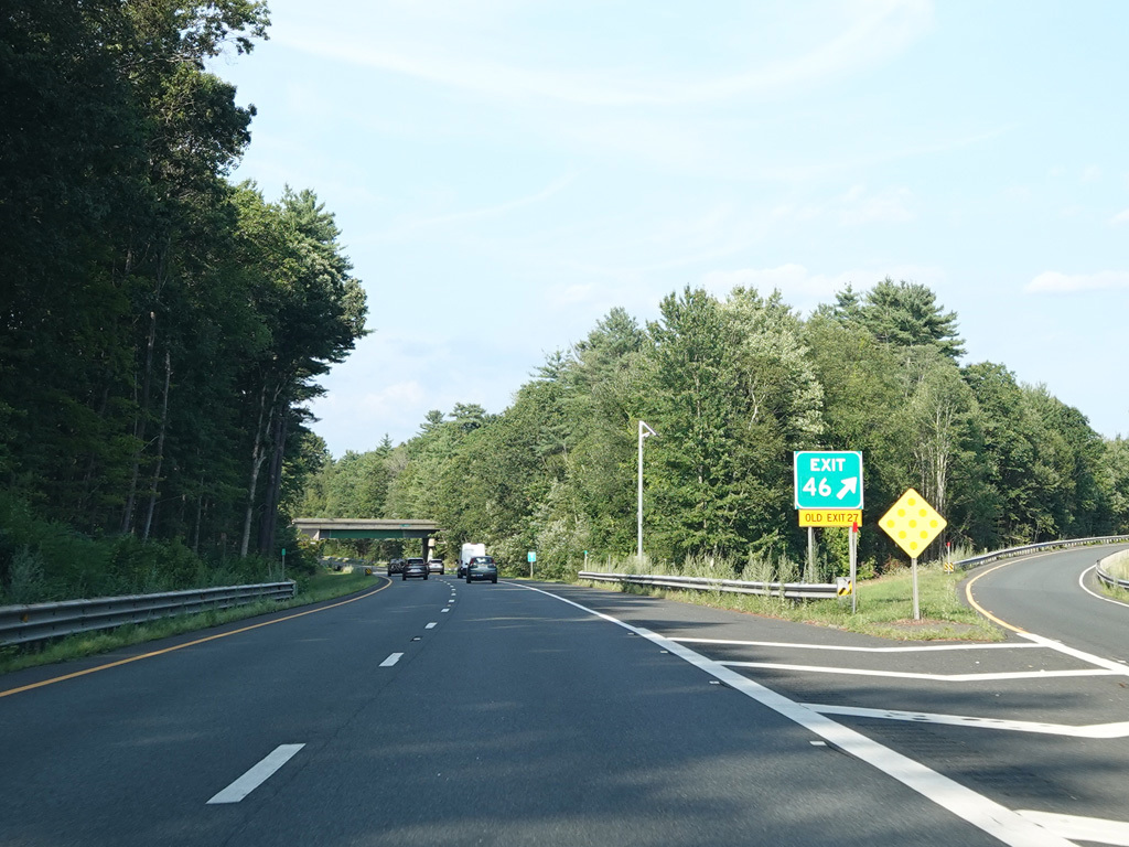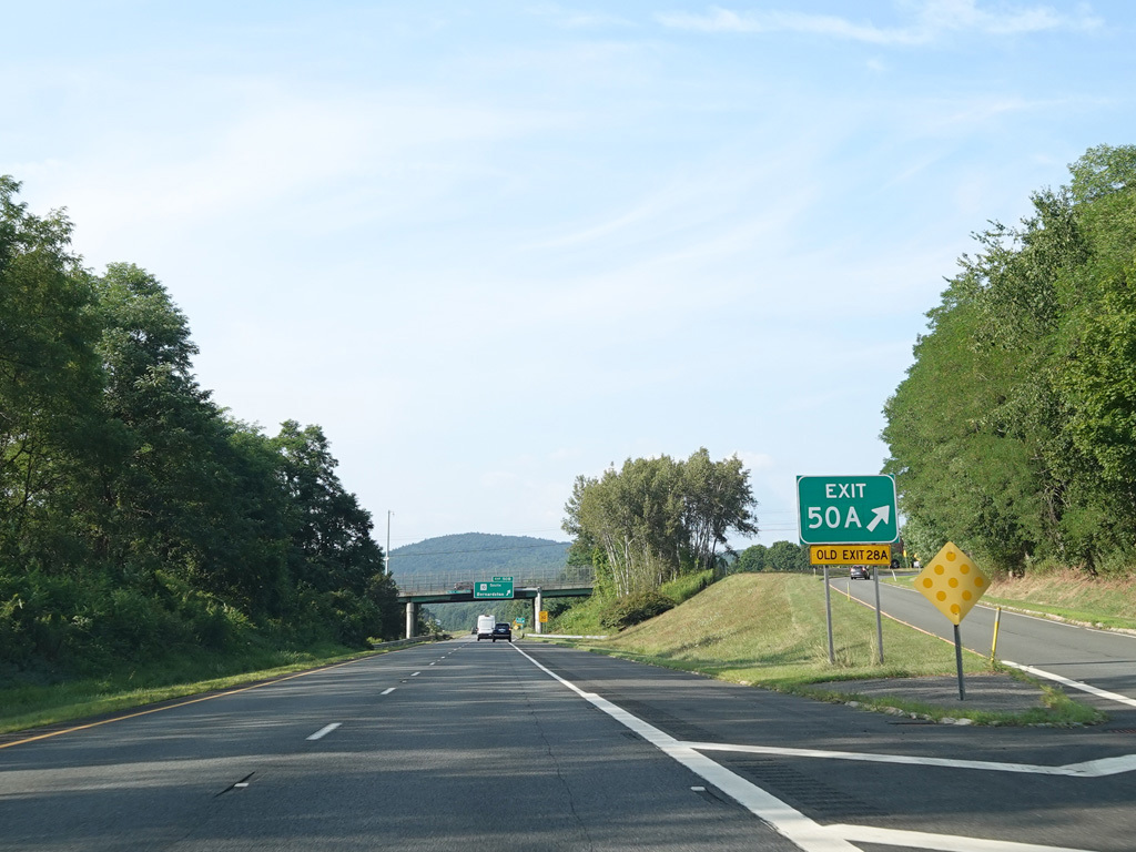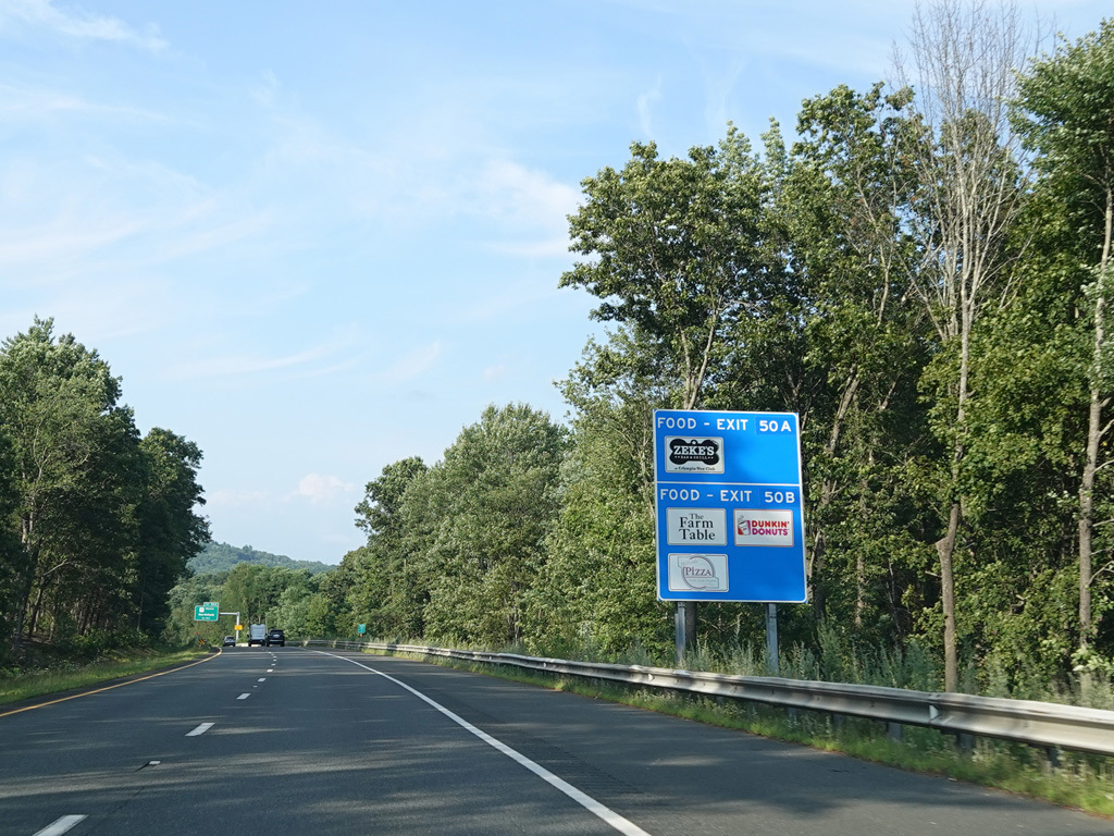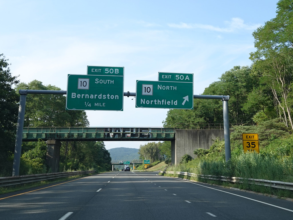Exit 50A is for Northfield Road (MA 10) north. Exit 50B is for Church Street (MA 10) south.