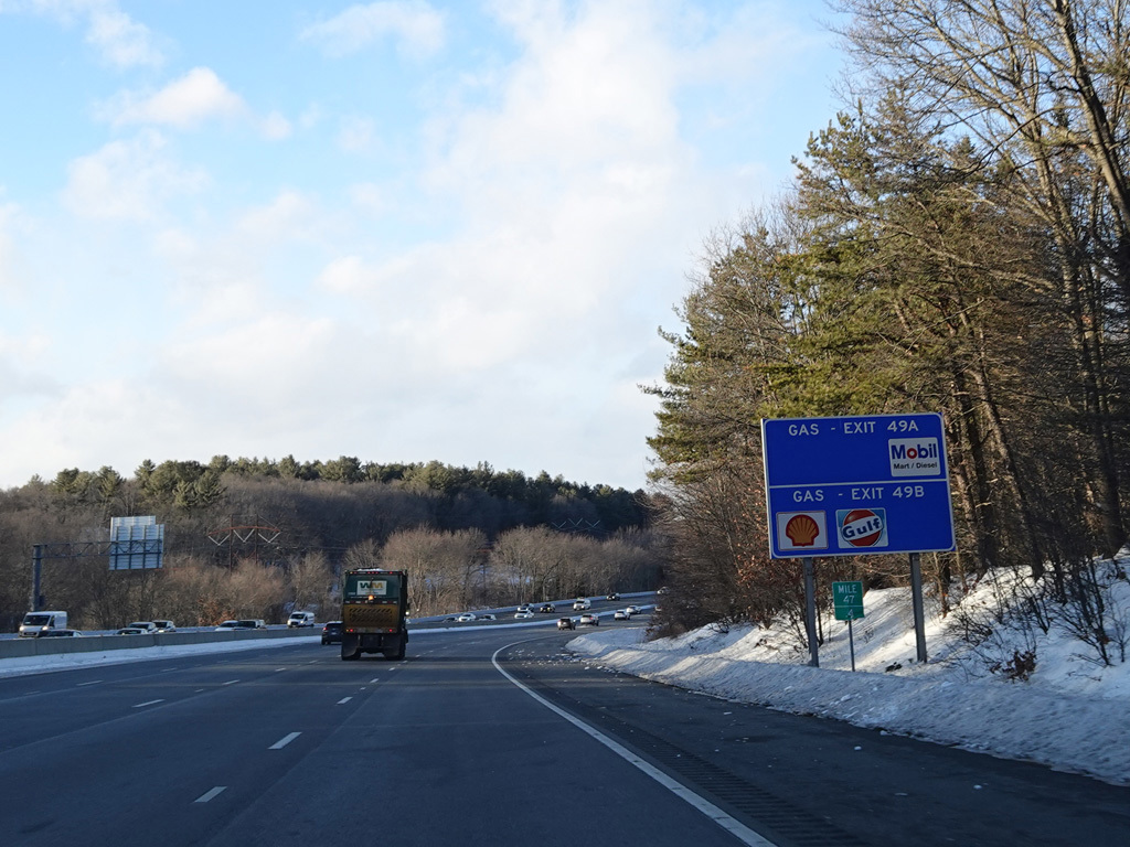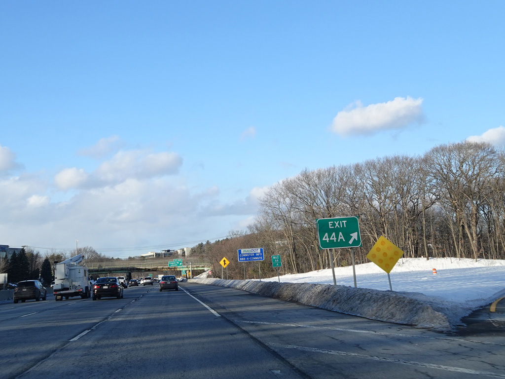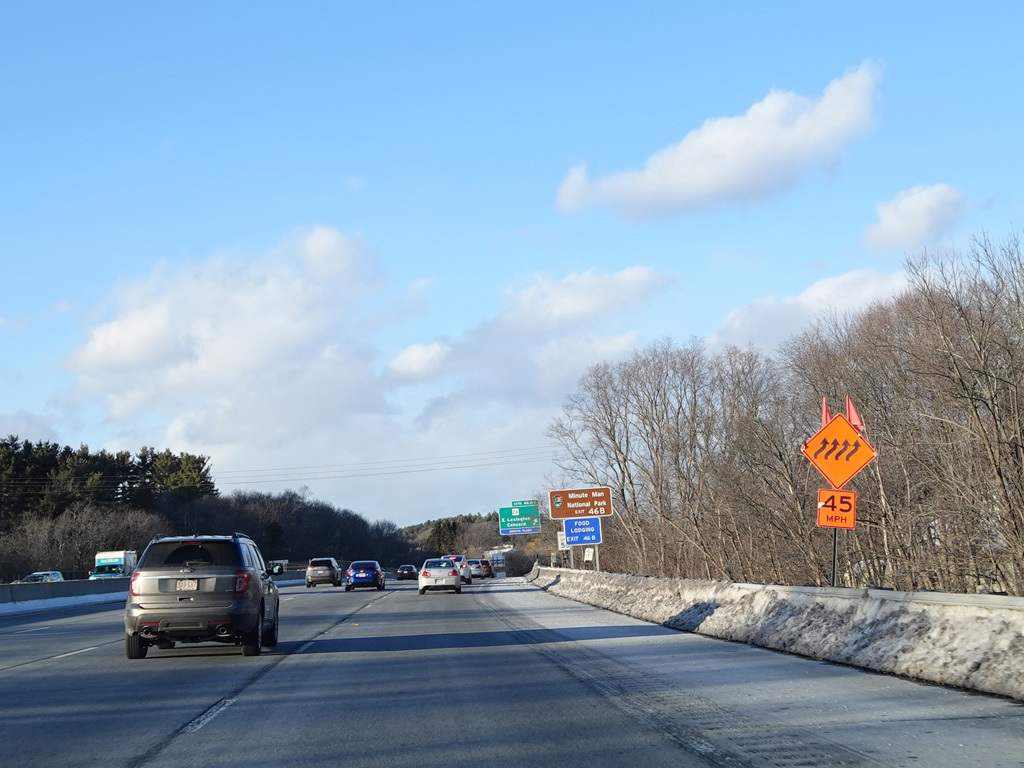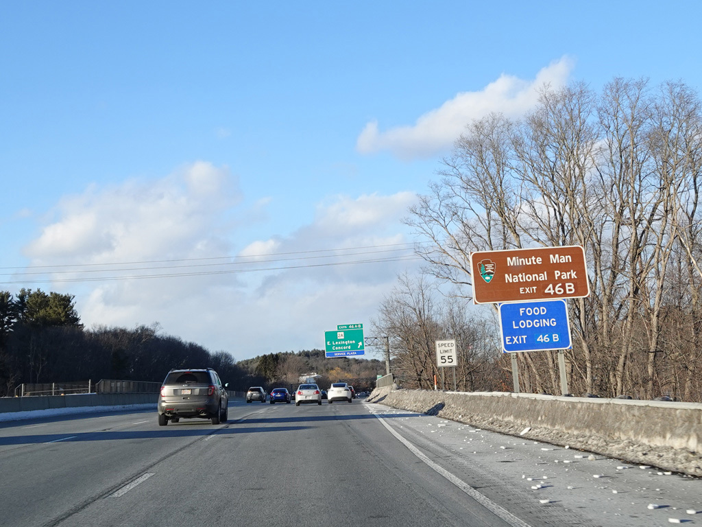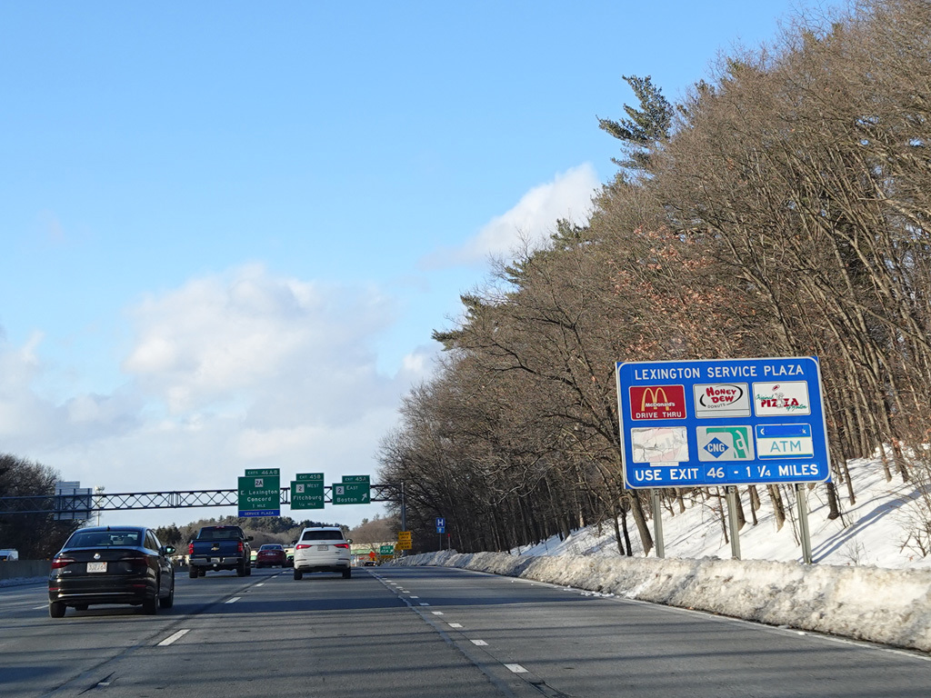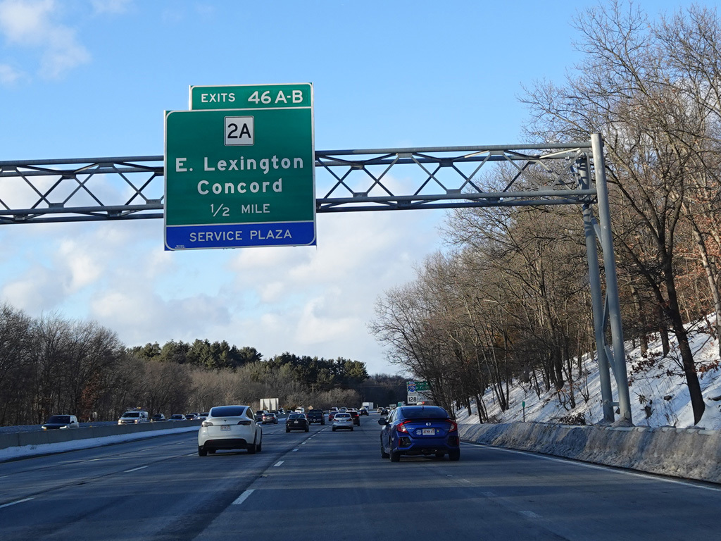 Exits 46A-B are for Marrett Road (MA 2A). The Lexington Service Plaza is also accessed through this ramp.