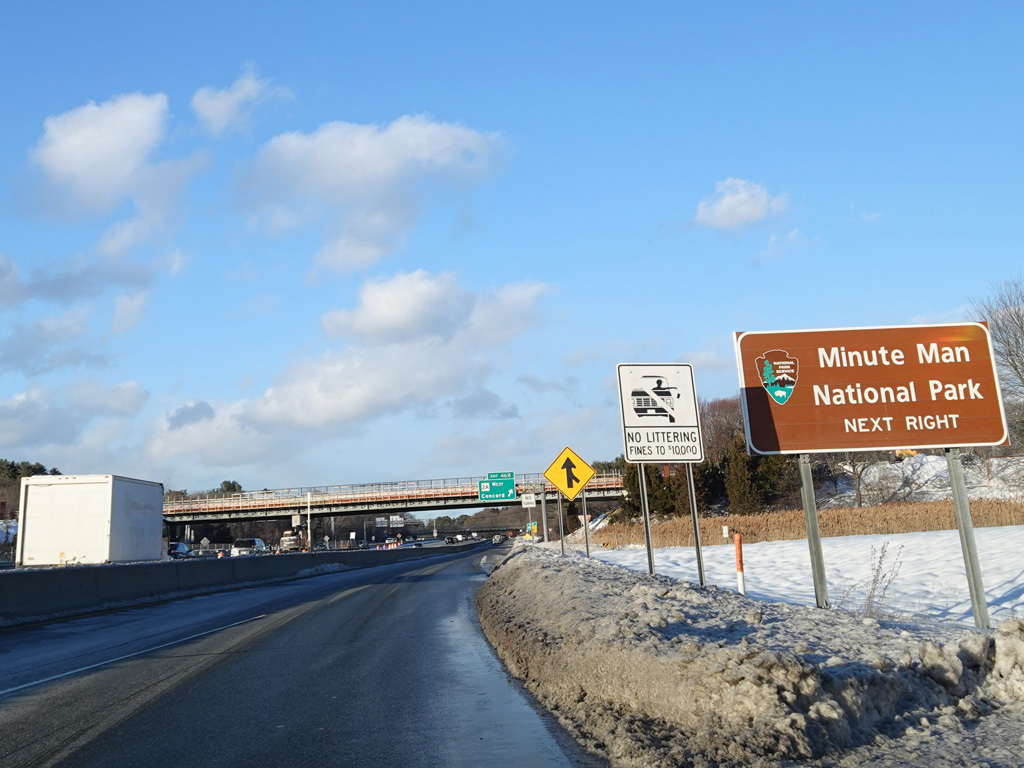 Exits 46A-B share a ramp when travelling north. Take the first exit to go east on Marrett Road (MA 2A) or the second exit to go west. The Lexington Service Plaza is located between the two exits.