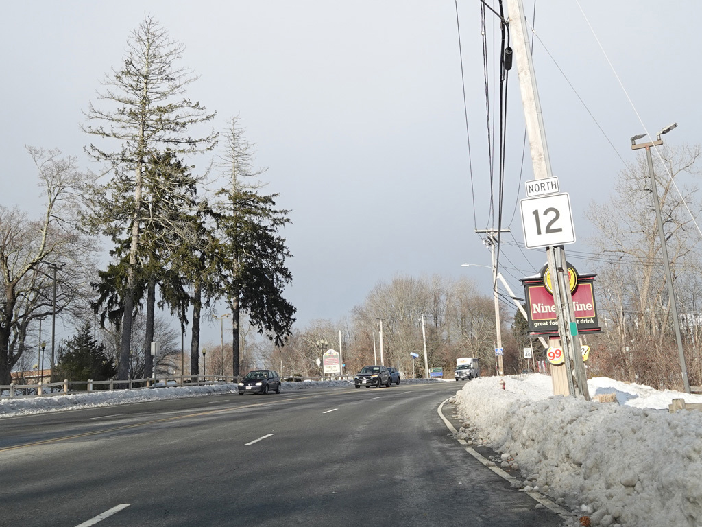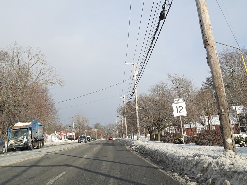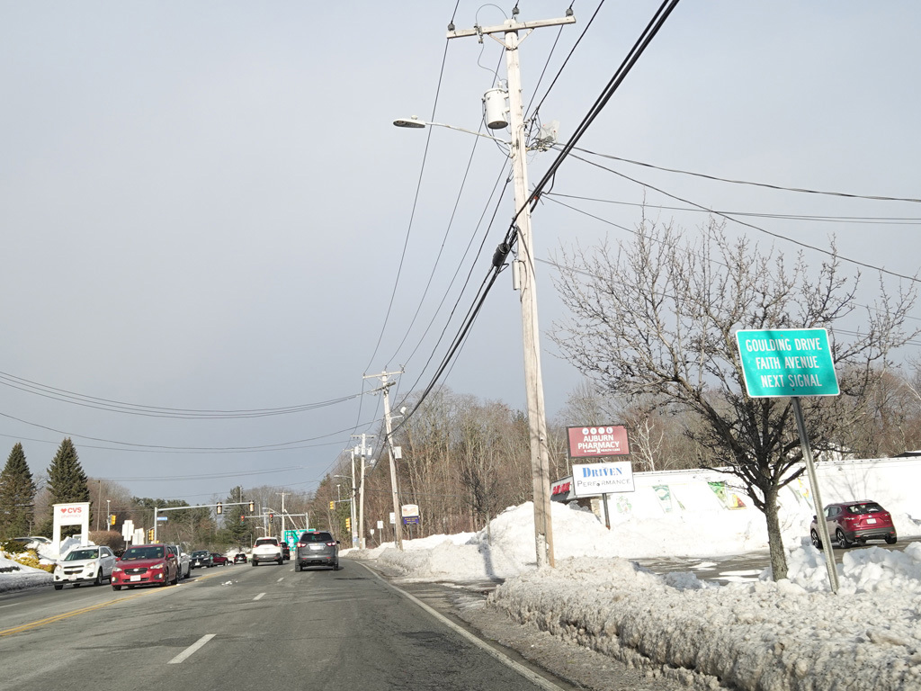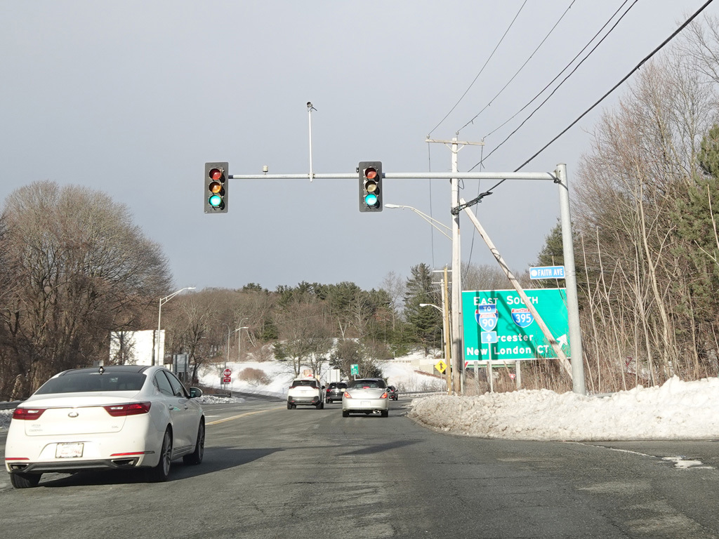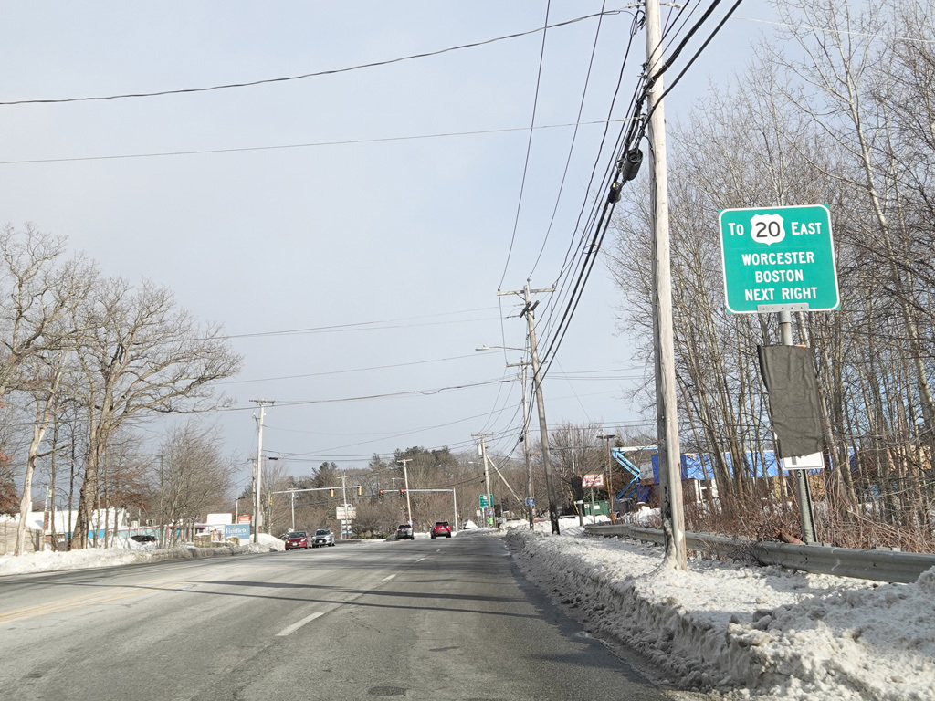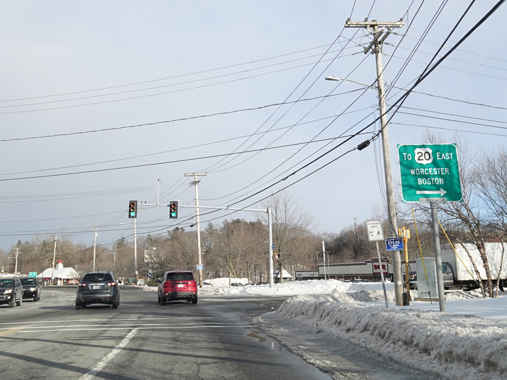 MA 12 splits off from US 20 and runs east as a four-lane undivided road. Here, it is known as Southbridge Street. There are traffic lights at West Street, Goulding Drive, and Faith Avenue.