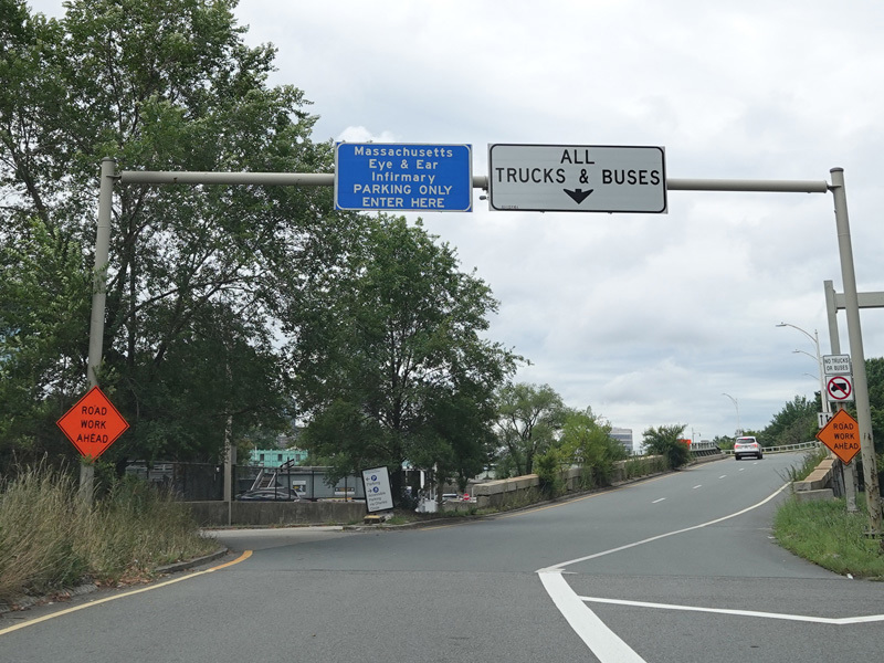 On the other side of the bridge, there is an exit for Memorial Drive on the right. Main Street is straight ahead. Take the exit to stay on MA 3. The signage erroneously indicates that Memorial Drive is designated US 3 here, but the designation doesn't change until a short distance further.