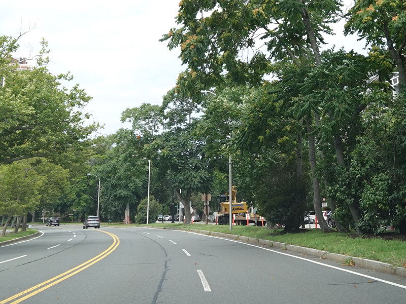 Fresh Pond Parkway runs north as a four-lane divided road with a grass median. After one block, the median ends.