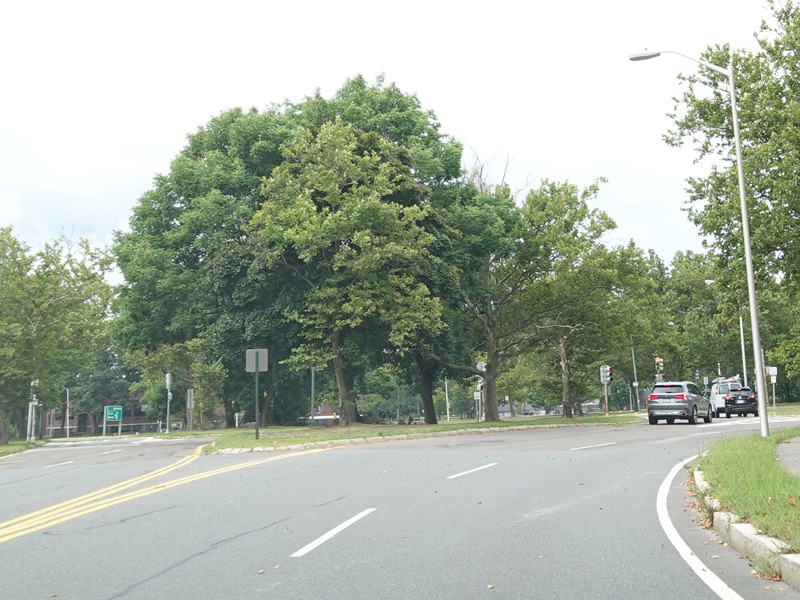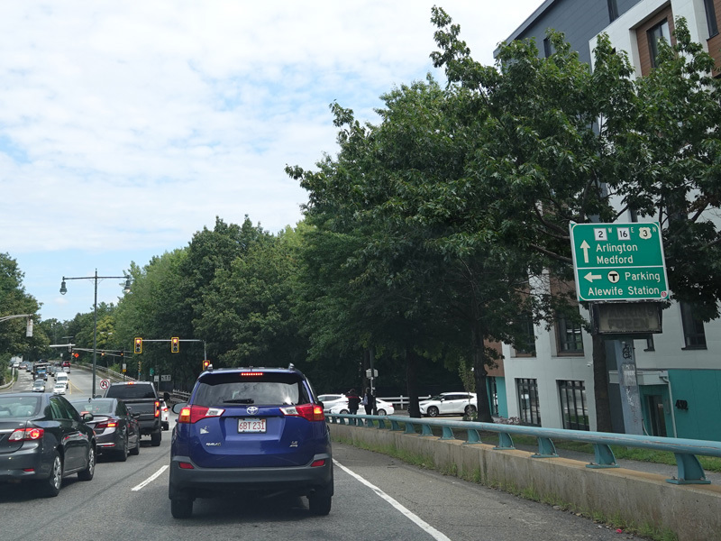 Alewife Brook Parkway runs north as a four-lane divided road with a grass median.