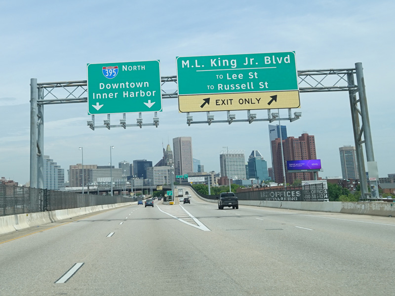 I-395 begins at I-95 in Baltimore. The one and only exit is for Martin Luther King Jr. Boulevard, Lee Street, and Russell Street.