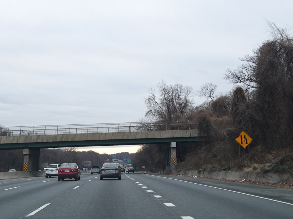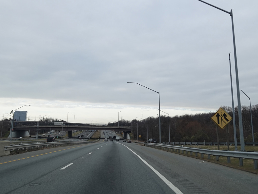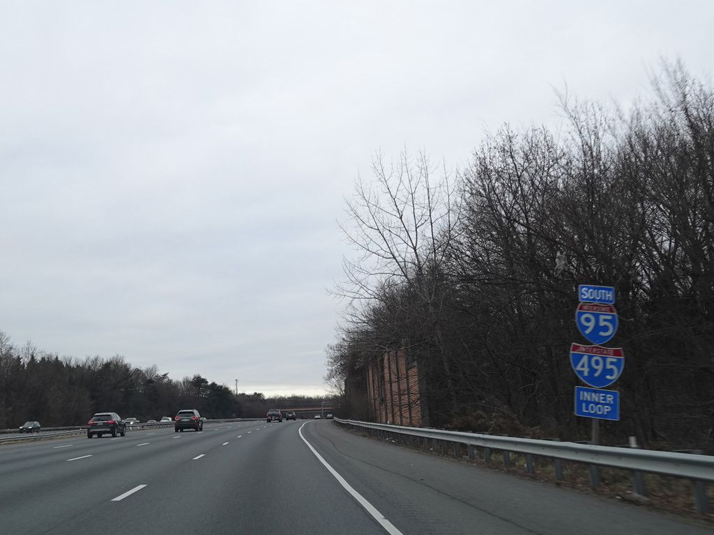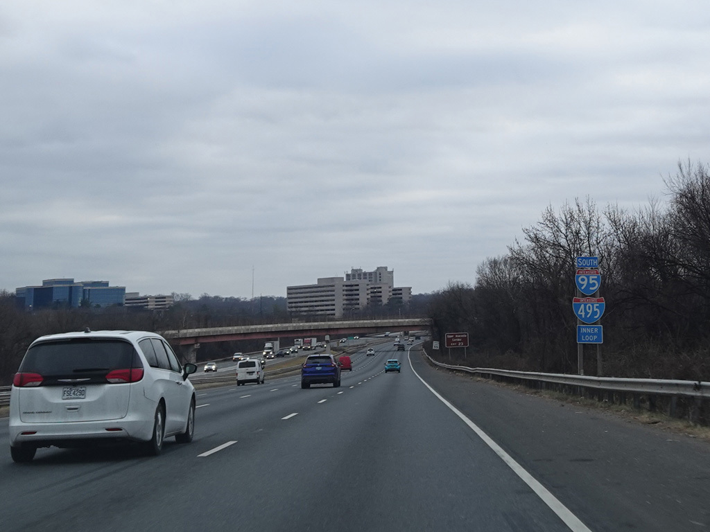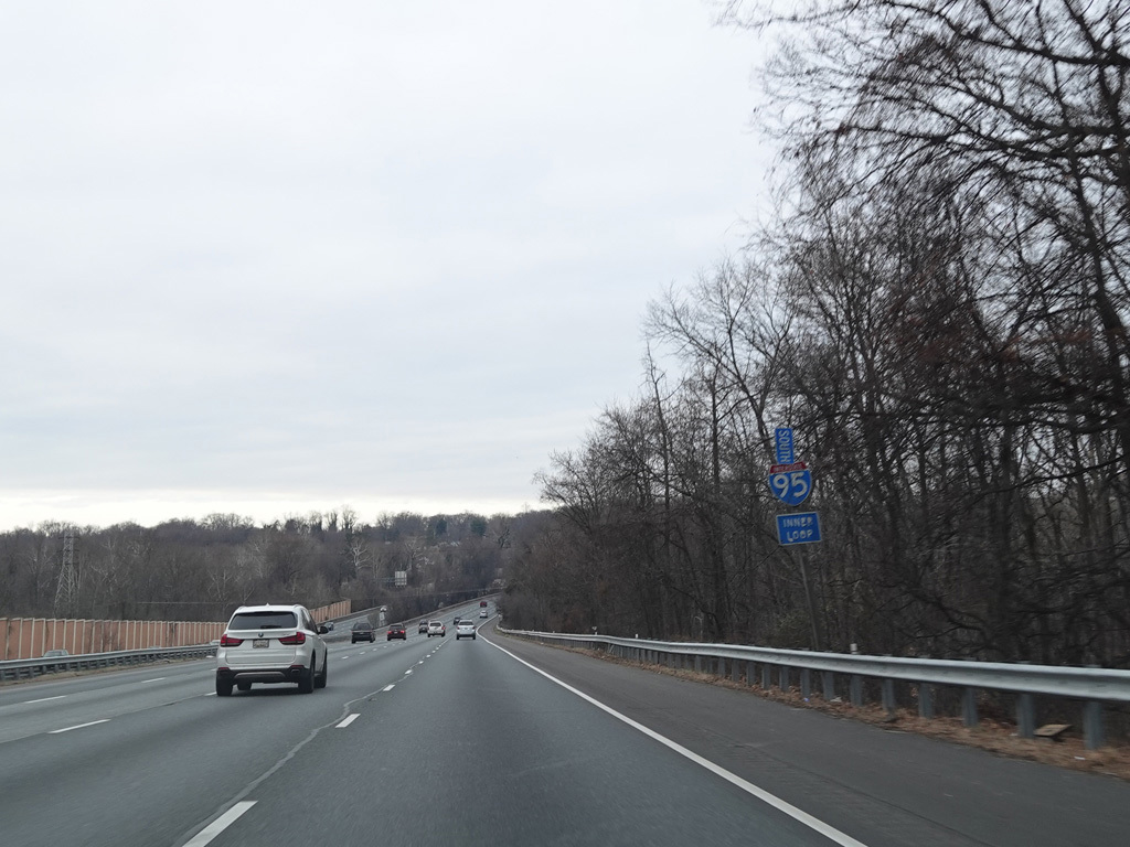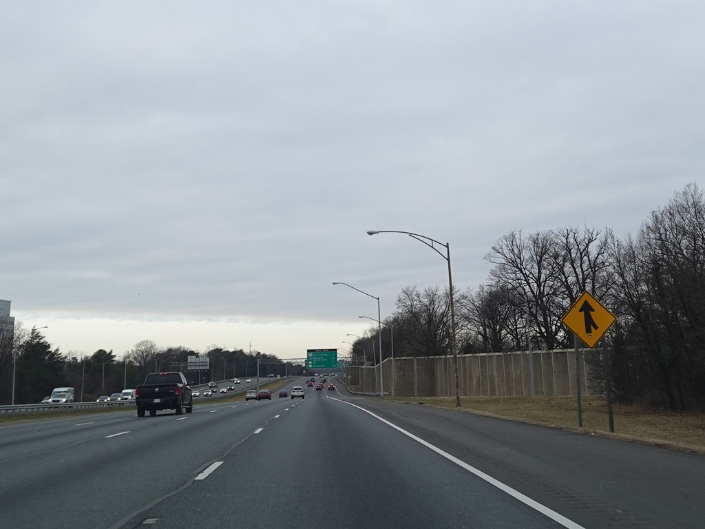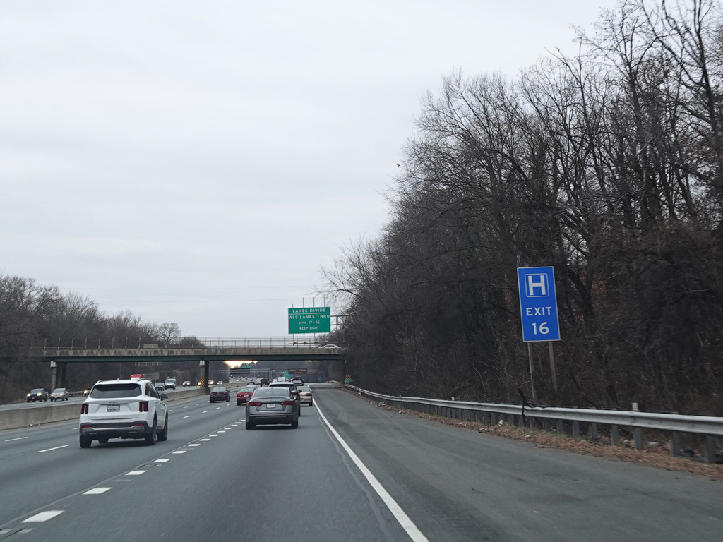 The Beltway splits into two sets of lanes. Bear right for access to exits 17-16. Through traffic may use either set of lanes.